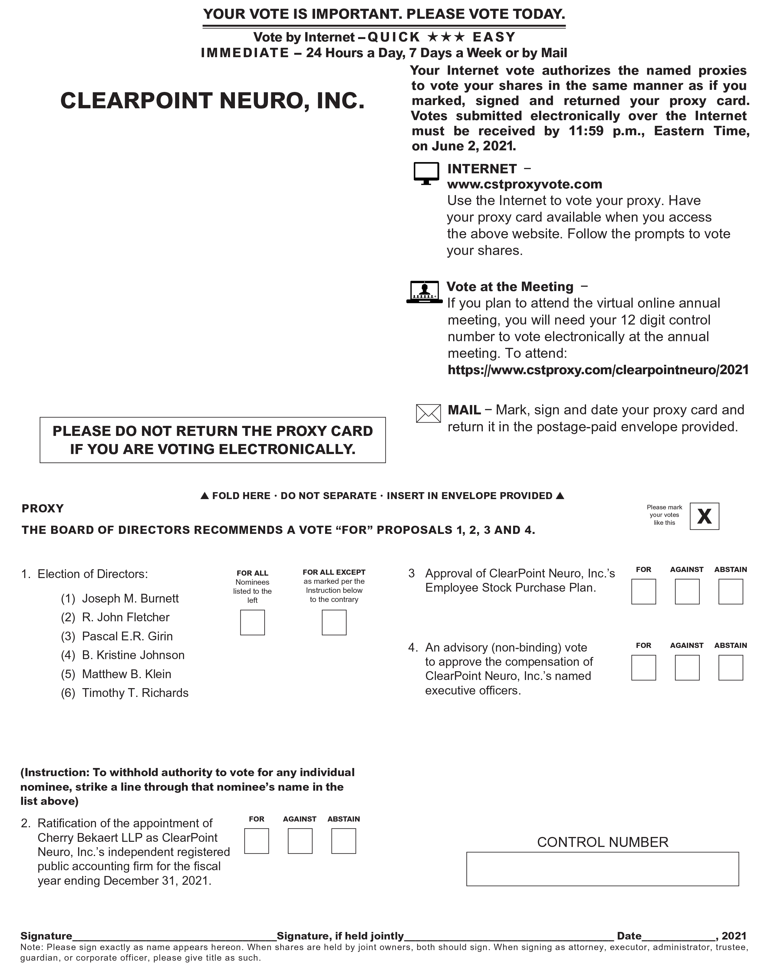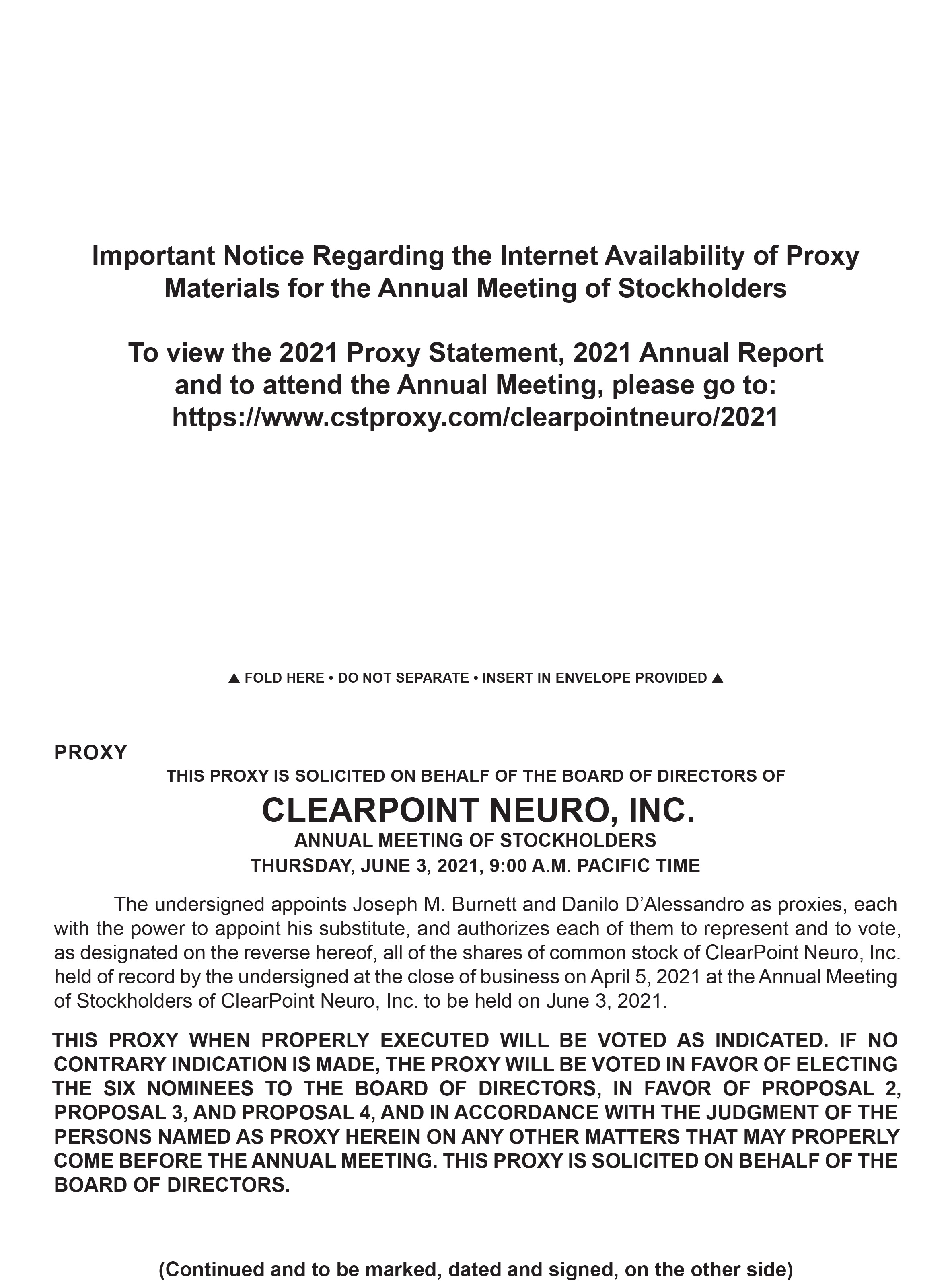 You are cordially invited to attend the Annual Meeting of Stockholders of ClearPoint Neuro, Inc. to be held on Thursday, June 3, 2021 at 9:00 a.m., Pacific Time. Our Annual Meeting will be held virtually via the Internet, with no physical, in-person meeting. With this letter, we have enclosed a copy of our Annual Report on Form 10-K for the year ended December 31, 2020, Notice of Annual Meeting of Stockholders, Proxy Statement and Proxy Card. These materials provide further information about our Annual Meeting. For more information on how to access and attend this year’s virtual Annual Meeting, please refer to the General Information section beginning on page 1 in the enclosed Proxy Statement. If you would like another copy of our Annual Report, please send your request to ClearPoint Neuro, Inc., Attn: Corporate Secretary, 5 Musick, Irvine, California 92618, and one will be mailed to you. It is also available on the Internet at https://www.cstproxy.com/clearpointneuro/2021.