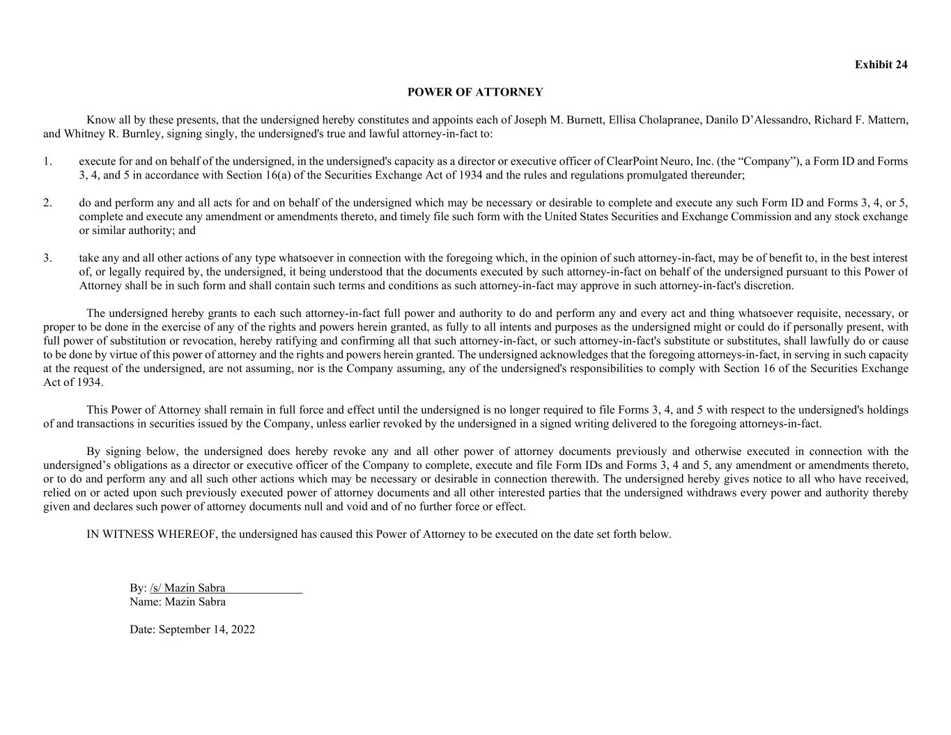 Exhibit 24 POWER OF ATTORNEY Know all by these presents, that the undersigned hereby constitutes and appoints each of Joseph M. Burnett, Ellisa Cholapranee, Danilo D’Alessandro, Richard F. Mattern, and Whitney R. Burnley, signing singly, the undersigned's true and lawful attorney-in-fact to: 1. execute for and on behalf of the undersigned, in the undersigned's capacity as a director or executive officer of ClearPoint Neuro, Inc. (the “Company”), a Form ID and Forms 3, 4, and 5 in accordance with Section 16(a) of the Securities Exchange Act of 1934 and the rules and regulations promulgated thereunder; 2. do and perform any and all acts for and on behalf of the undersigned which may be necessary or desirable to complete and execute any such Form ID and Forms 3, 4, or 5, complete and execute any amendment or amendments thereto, and timely file such form with the United States Securities and Exchange Commission and any stock exchange or similar authority; and 3. take any and all other actions of any type whatsoever in connection with the foregoing which, in the opinion of such attorney-in-fact, may be of benefit to, in the best interest of, or legally required by, the undersigned, it being understood that the documents executed by such attorney-in-fact on behalf of the undersigned pursuant to this Power of Attorney shall be in such form and shall contain such terms and conditions as such attorney-in-fact may approve in such attorney-in-fact's discretion. The undersigned hereby grants to each such attorney-in-fact full power and authority to do and perform any and every act and thing whatsoever requisite, necessary, or proper to be done in the exercise of any of the rights and powers herein granted, as fully to all intents and purposes as the undersigned might or could do if personally present, with full power of substitution or revocation, hereby ratifying and confirming all that such attorney-in-fact, or such attorney-in-fact's substitute or substitutes, shall lawfully do or cause to be done by virtue of this power of attorney and the rights and powers herein granted. The undersigned acknowledges that the foregoing attorneys-in-fact, in serving in such capacity at the request of the undersigned, are not assuming, nor is the Company assuming, any of the undersigned's responsibilities to comply with Section 16 of the Securities Exchange Act of 1934. This Power of Attorney shall remain in full force and effect until the undersigned is no longer required to file Forms 3, 4, and 5 with respect to the undersigned's holdings of and transactions in securities issued by the Company, unless earlier revoked by the undersigned in a signed writing delivered to the foregoing attorneys-in-fact. By signing below, the undersigned does hereby revoke any and all other power of attorney documents previously and otherwise executed in connection with the undersigned’s obligations as a director or executive officer of the Company to complete, execute and file Form IDs and Forms 3, 4 and 5, any amendment or amendments thereto, or to do and perform any and all such other actions which may be necessary or desirable in connection therewith. The undersigned hereby gives notice to all who have received, relied on or acted upon such previously executed power of attorney documents and all other interested parties that the undersigned withdraws every power and authority thereby given and declares such power of attorney documents null and void and of no further force or effect. IN WITNESS WHEREOF, the undersigned has caused this Power of Attorney to be executed on the date set forth below. By: /s/ Mazin Sabra Name: Mazin Sabra Date: September 14, 2022