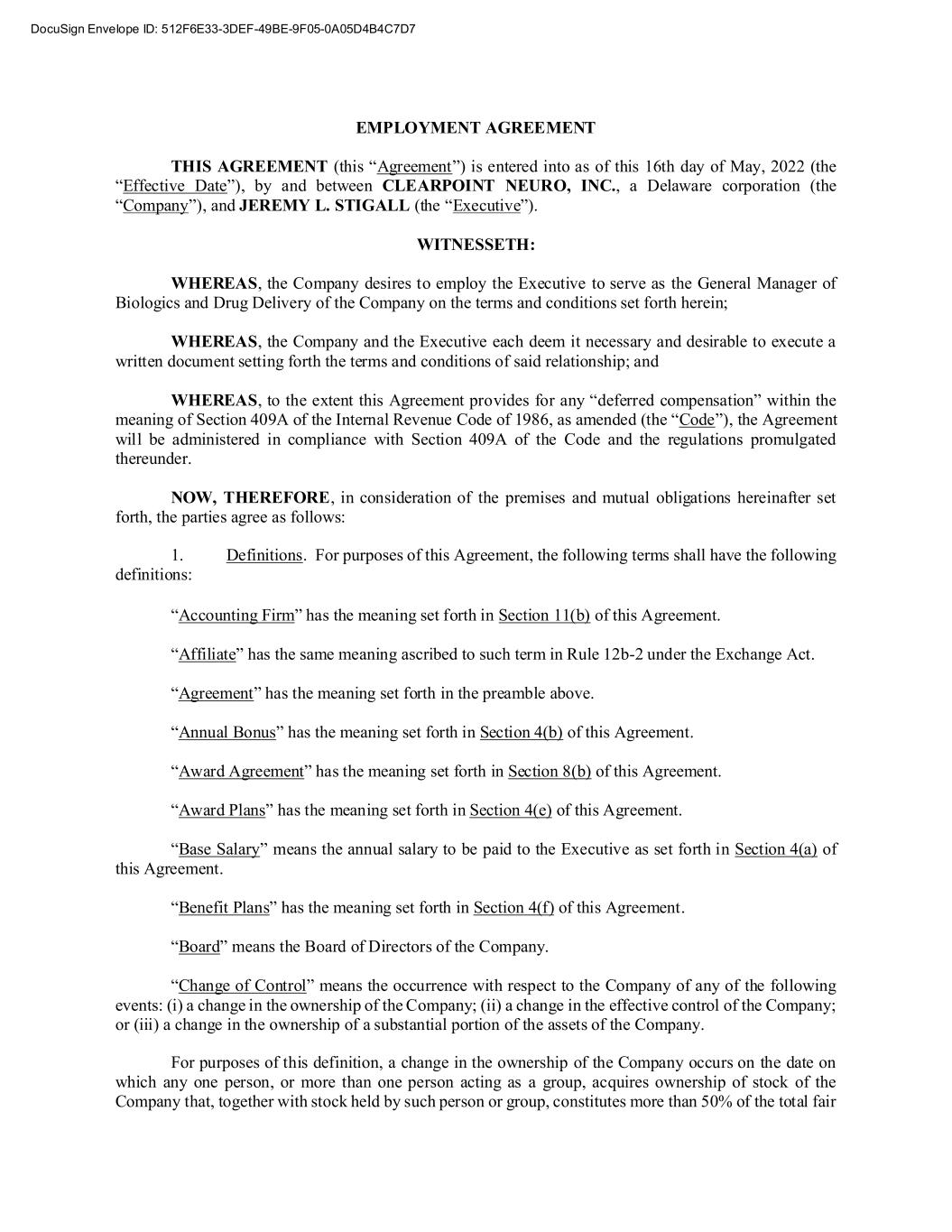 EMPLOYMENT AGREEMENT THIS AGREEMENT (this “Agreement”) is entered into as of this 16th day of May, 2022 (the “Effective Date”), by and between CLEARPOINT NEURO, INC., a Delaware corporation (the “Company”), and JEREMY L. STIGALL (the “Executive”). WITNESSETH: WHEREAS, the Company desires to employ the Executive to serve as the General Manager of Biologics and Drug Delivery of the Company on the terms and conditions set forth herein; WHEREAS, the Company and the Executive each deem it necessary and desirable to execute a written document setting forth the terms and conditions of said relationship; and WHEREAS, to the extent this Agreement provides for any “deferred compensation” within the meaning of Section 409A of the Internal Revenue Code of 1986, as amended (the “Code”), the Agreement will be administered in compliance with Section 409A of the Code and the regulations promulgated thereunder. NOW, THEREFORE, in consideration of the premises and mutual obligations hereinafter set forth, the parties agree as follows: 1. Definitions. For purposes of this Agreement, the following terms shall have the following definitions: “Accounting Firm” has the meaning set forth in Section 11(b) of this Agreement. “Affiliate” has the same meaning ascribed to such term in Rule 12b-2 under the Exchange Act. “Agreement” has the meaning set forth in the preamble above. “Annual Bonus” has the meaning set forth in Section 4(b) of this Agreement. “Award Agreement” has the meaning set forth in Section 8(b) of this Agreement. “Award Plans” has the meaning set forth in Section 4(e) of this Agreement. “Base Salary” means the annual salary to be paid to the Executive as set forth in Section 4(a) of this Agreement. “Benefit Plans” has the meaning set forth in Section 4(f) of this Agreement. “Board” means the Board of Directors of the Company. “Change of Control” means the occurrence with respect to the Company of any of the following events: (i) a change in the ownership of the Company; (ii) a change in the effective control of the Company; or (iii) a change in the ownership of a substantial portion of the assets of the Company. For purposes of this definition, a change in the ownership of the Company occurs on the date on which any one person, or more than one person acting as a group, acquires ownership of stock of the Company that, together with stock held by such person or group, constitutes more than 50% of the total fair