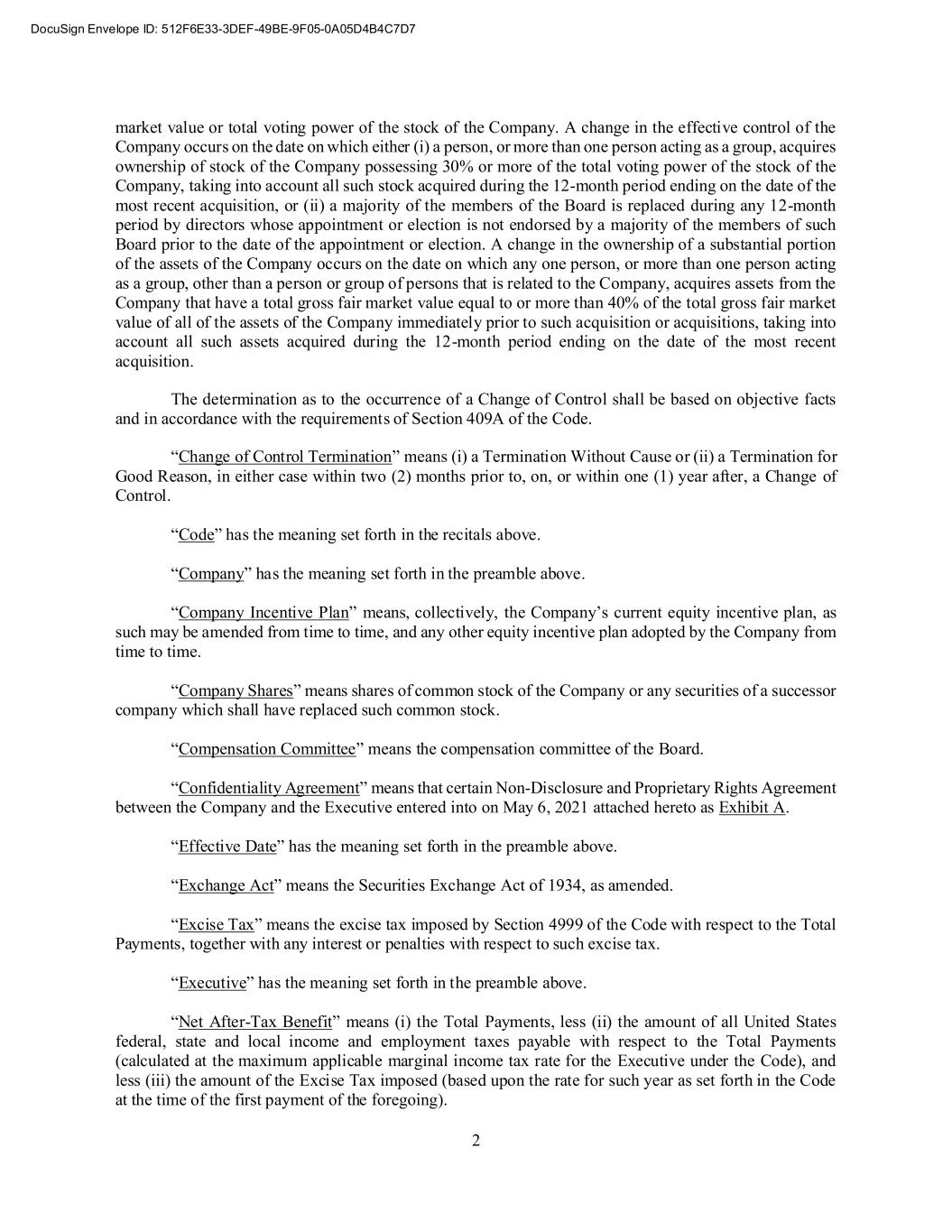 2 market value or total voting power of the stock of the Company. A change in the effective control of the Company occurs on the date on which either (i) a person, or more than one person acting as a group, acquires ownership of stock of the Company possessing 30% or more of the total voting power of the stock of the Company, taking into account all such stock acquired during the 12-month period ending on the date of the most recent acquisition, or (ii) a majority of the members of the Board is replaced during any 12-month period by directors whose appointment or election is not endorsed by a majority of the members of such Board prior to the date of the appointment or election. A change in the ownership of a substantial portion of the assets of the Company occurs on the date on which any one person, or more than one person acting as a group, other than a person or group of persons that is related to the Company, acquires assets from the Company that have a total gross fair market value equal to or more than 40% of the total gross fair market value of all of the assets of the Company immediately prior to such acquisition or acquisitions, taking into account all such assets acquired during the 12-month period ending on the date of the most recent acquisition. The determination as to the occurrence of a Change of Control shall be based on objective facts and in accordance with the requirements of Section 409A of the Code. “Change of Control Termination” means (i) a Termination Without Cause or (ii) a Termination for Good Reason, in either case within two (2) months prior to, on, or within one (1) year after, a Change of Control. “Code” has the meaning set forth in the recitals above. “Company” has the meaning set forth in the preamble above. “Company Incentive Plan” means, collectively, the Company’s current equity incentive plan, as such may be amended from time to time, and any other equity incentive plan adopted by the Company from time to time. “Company Shares” means shares of common stock of the Company or any securities of a successor company which shall have replaced such common stock. “Compensation Committee” means the compensation committee of the Board. “Confidentiality Agreement” means that certain Non-Disclosure and Proprietary Rights Agreement between the Company and the Executive entered into on May 6, 2021 attached hereto as Exhibit A. “Effective Date” has the meaning set forth in the preamble above. “Exchange Act” means the Securities Exchange Act of 1934, as amended. “Excise Tax” means the excise tax imposed by Section 4999 of the Code with respect to the Total Payments, together with any interest or penalties with respect to such excise tax. “Executive” has the meaning set forth in the preamble above. “Net After-Tax Benefit” means (i) the Total Payments, less (ii) the amount of all United States federal, state and local income and employment taxes payable with respect to the Total Payments (calculated at the maximum applicable marginal income tax rate for the Executive under the Code), and less (iii) the amount of the Excise Tax imposed (based upon the rate for such year as set forth in the Code at the time of the first payment of the foregoing).