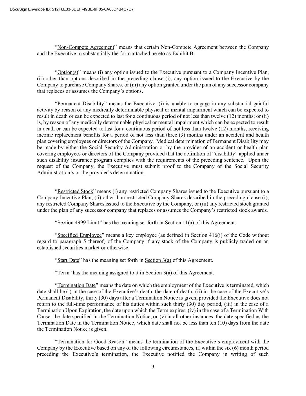 3 “Non-Compete Agreement” means that certain Non-Compete Agreement between the Company and the Executive in substantially the form attached hereto as Exhibit B. “Option(s)” means (i) any option issued to the Executive pursuant to a Company Incentive Plan, (ii) other than options described in the preceding clause (i), any option issued to the Executive by the Company to purchase Company Shares, or (iii) any option granted under the plan of any successor company that replaces or assumes the Company’s options. “Permanent Disability” means the Executive: (i) is unable to engage in any substantial gainful activity by reason of any medically determinable physical or mental impairment which can be expected to result in death or can be expected to last for a continuous period of not less than twelve (12) months; or (ii) is, by reason of any medically determinable physical or mental impairment which can be expected to result in death or can be expected to last for a continuous period of not less than twelve (12) months, receiving income replacement benefits for a period of not less than three (3) months under an accident and health plan covering employees or directors of the Company. Medical determination of Permanent Disability may be made by either the Social Security Administration or by the provider of an accident or health plan covering employees or directors of the Company provided that the definition of “disability” applied under such disability insurance program complies with the requirements of the preceding sentence. Upon the request of the Company, the Executive must submit proof to the Company of the Social Security Administration’s or the provider’s determination. “Restricted Stock” means (i) any restricted Company Shares issued to the Executive pursuant to a Company Incentive Plan, (ii) other than restricted Company Shares described in the preceding clause (i), any restricted Company Shares issued to the Executive by the Company, or (iii) any restricted stock granted under the plan of any successor company that replaces or assumes the Company’s restricted stock awards. “Section 4999 Limit” has the meaning set forth in Section 11(a) of this Agreement. “Specified Employee” means a key employee (as defined in Section 416(i) of the Code without regard to paragraph 5 thereof) of the Company if any stock of the Company is publicly traded on an established securities market or otherwise. “Start Date” has the meaning set forth in Section 3(a) of this Agreement. “Term” has the meaning assigned to it in Section 3(a) of this Agreement. “Termination Date” means the date on which the employment of the Executive is terminated, which date shall be (i) in the case of the Executive’s death, the date of death, (ii) in the case of the Executive’s Permanent Disability, thirty (30) days after a Termination Notice is given, provided the Executive does not return to the full-time performance of his duties within such thirty (30) day period, (iii) in the case of a Termination Upon Expiration, the date upon which the Term expires, (iv) in the case of a Termination With Cause, the date specified in the Termination Notice, or (v) in all other instances, the date specified as the Termination Date in the Termination Notice, which date shall not be less than ten (10) days from the date the Termination Notice is given. “Termination for Good Reason” means the termination of the Executive’s employment with the Company by the Executive based on any of the following circumstances, if, within the six (6) month period preceding the Executive’s termination, the Executive notified the Company in writing of such