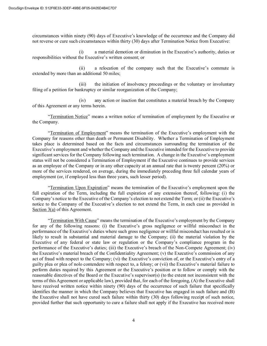 4 circumstances within ninety (90) days of Executive’s knowledge of the occurrence and the Company did not reverse or cure such circumstances within thirty (30) days after Termination Notice from Executive: (i) a material demotion or diminution in the Executive’s authority, duties or responsibilities without the Executive’s written consent; or (ii) a relocation of the company such that the Executive’s commute is extended by more than an additional 50 miles; (iii) the initiation of insolvency proceedings or the voluntary or involuntary filing of a petition for bankruptcy or similar reorganization of the Company; (iv) any action or inaction that constitutes a material breach by the Company of this Agreement or any terms herein. “Termination Notice” means a written notice of termination of employment by the Executive or the Company. “Termination of Employment” means the termination of the Executive’s employment with the Company for reasons other than death or Permanent Disability. Whether a Termination of Employment takes place is determined based on the facts and circumstances surrounding the termination of the Executive’s employment and whether the Company and the Executive intended for the Executive to provide significant services for the Company following such termination. A change in the Executive’s employment status will not be considered a Termination of Employment if the Executive continues to provide services as an employee of the Company or in any other capacity at an annual rate that is twenty percent (20%) or more of the services rendered, on average, during the immediately preceding three full calendar years of employment (or, if employed less than three years, such lesser period). “Termination Upon Expiration” means the termination of the Executive’s employment upon the full expiration of the Term, including the full expiration of any extension thereof, following: (i) the Company’s notice to the Executive of the Company’s election to not extend the Term; or (ii) the Executive’s notice to the Company of the Executive’s election to not extend the Term, in each case as provided in Section 3(a) of this Agreement. “Termination With Cause” means the termination of the Executive’s employment by the Company for any of the following reasons: (i) the Executive’s gross negligence or willful misconduct in the performance of the Executive’s duties where such gross negligence or willful misconduct has resulted or is likely to result in substantial and material damage to the Company; (ii) the material violation by the Executive of any federal or state law or regulation or the Company’s compliance program in the performance of the Executive’s duties; (iii) the Executive’s breach of the Non-Compete Agreement; (iv) the Executive’s material breach of the Confidentiality Agreement; (v) the Executive’s commission of any act of fraud with respect to the Company; (vi) the Executive’s conviction of, or the Executive’s entry of a guilty plea or plea of nolo contendere with respect to, a felony; or (vii) the Executive’s material failure to perform duties required by this Agreement or the Executive’s position or to follow or comply with the reasonable directives of the Board or the Executive’s supervisor(s) (to the extent not inconsistent with the terms of this Agreement or applicable law), provided that, for each of the foregoing, (A) the Executive shall have received written notice within ninety (90) days of the occurrence of such failure that specifically identifies the manner in which the Company believes that Executive has engaged in such failure and (B) the Executive shall not have cured such failure within thirty (30) days following receipt of such notice, provided further that such opportunity to cure a failure shall not apply if the Executive has received more