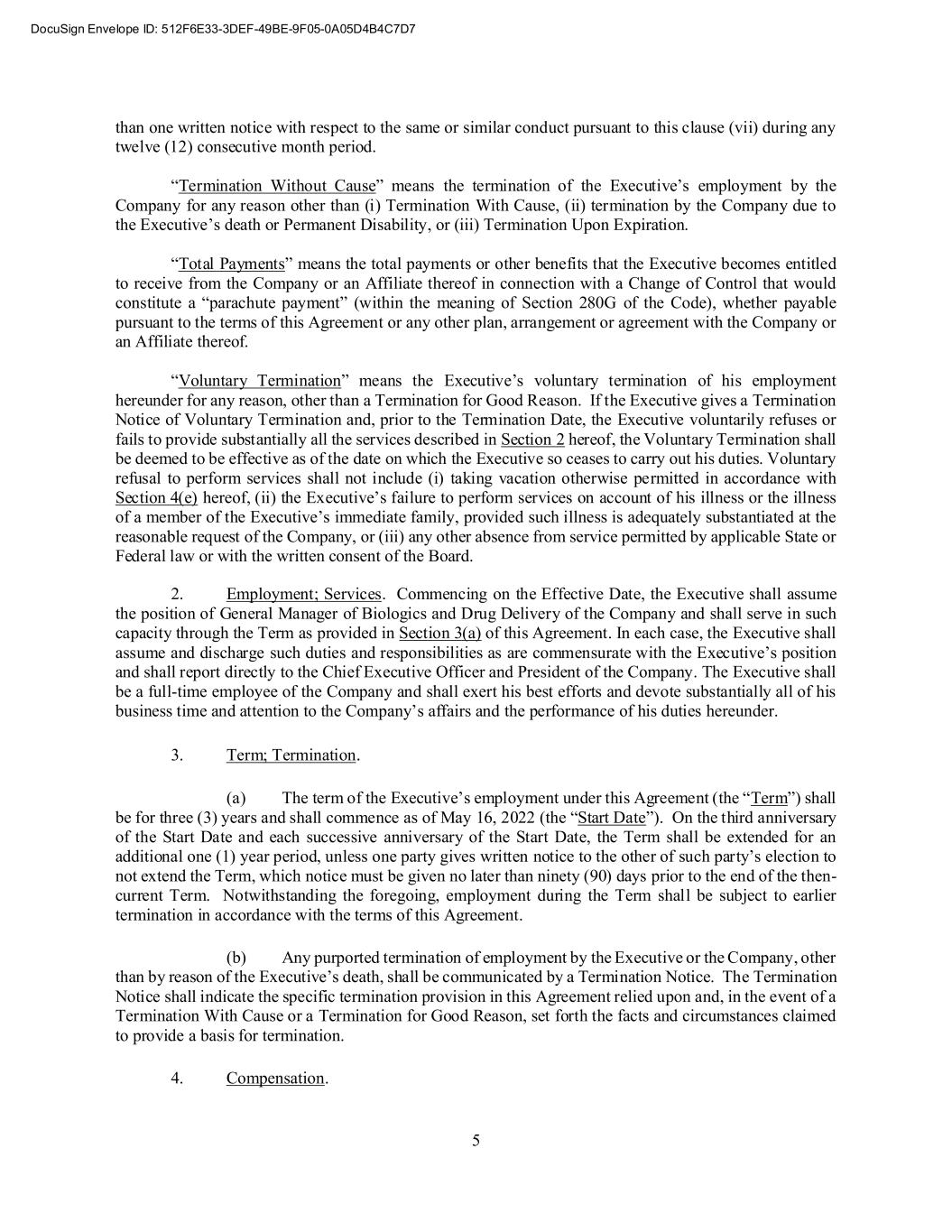 5 than one written notice with respect to the same or similar conduct pursuant to this clause (vii) during any twelve (12) consecutive month period. “Termination Without Cause” means the termination of the Executive’s employment by the Company for any reason other than (i) Termination With Cause, (ii) termination by the Company due to the Executive’s death or Permanent Disability, or (iii) Termination Upon Expiration. “Total Payments” means the total payments or other benefits that the Executive becomes entitled to receive from the Company or an Affiliate thereof in connection with a Change of Control that would constitute a “parachute payment” (within the meaning of Section 280G of the Code), whether payable pursuant to the terms of this Agreement or any other plan, arrangement or agreement with the Company or an Affiliate thereof. “Voluntary Termination” means the Executive’s voluntary termination of his employment hereunder for any reason, other than a Termination for Good Reason. If the Executive gives a Termination Notice of Voluntary Termination and, prior to the Termination Date, the Executive voluntarily refuses or fails to provide substantially all the services described in Section 2 hereof, the Voluntary Termination shall be deemed to be effective as of the date on which the Executive so ceases to carry out his duties. Voluntary refusal to perform services shall not include (i) taking vacation otherwise permitted in accordance with Section 4(e) hereof, (ii) the Executive’s failure to perform services on account of his illness or the illness of a member of the Executive’s immediate family, provided such illness is adequately substantiated at the reasonable request of the Company, or (iii) any other absence from service permitted by applicable State or Federal law or with the written consent of the Board. 2. Employment; Services. Commencing on the Effective Date, the Executive shall assume the position of General Manager of Biologics and Drug Delivery of the Company and shall serve in such capacity through the Term as provided in Section 3(a) of this Agreement. In each case, the Executive shall assume and discharge such duties and responsibilities as are commensurate with the Executive’s position and shall report directly to the Chief Executive Officer and President of the Company. The Executive shall be a full-time employee of the Company and shall exert his best efforts and devote substantially all of his business time and attention to the Company’s affairs and the performance of his duties hereunder. 3. Term; Termination. (a) The term of the Executive’s employment under this Agreement (the “Term”) shall be for three (3) years and shall commence as of May 16, 2022 (the “Start Date”). On the third anniversary of the Start Date and each successive anniversary of the Start Date, the Term shall be extended for an additional one (1) year period, unless one party gives written notice to the other of such party’s election to not extend the Term, which notice must be given no later than ninety (90) days prior to the end of the then- current Term. Notwithstanding the foregoing, employment during the Term shall be subject to earlier termination in accordance with the terms of this Agreement. (b) Any purported termination of employment by the Executive or the Company, other than by reason of the Executive’s death, shall be communicated by a Termination Notice. The Termination Notice shall indicate the specific termination provision in this Agreement relied upon and, in the event of a Termination With Cause or a Termination for Good Reason, set forth the facts and circumstances claimed to provide a basis for termination. 4. Compensation.