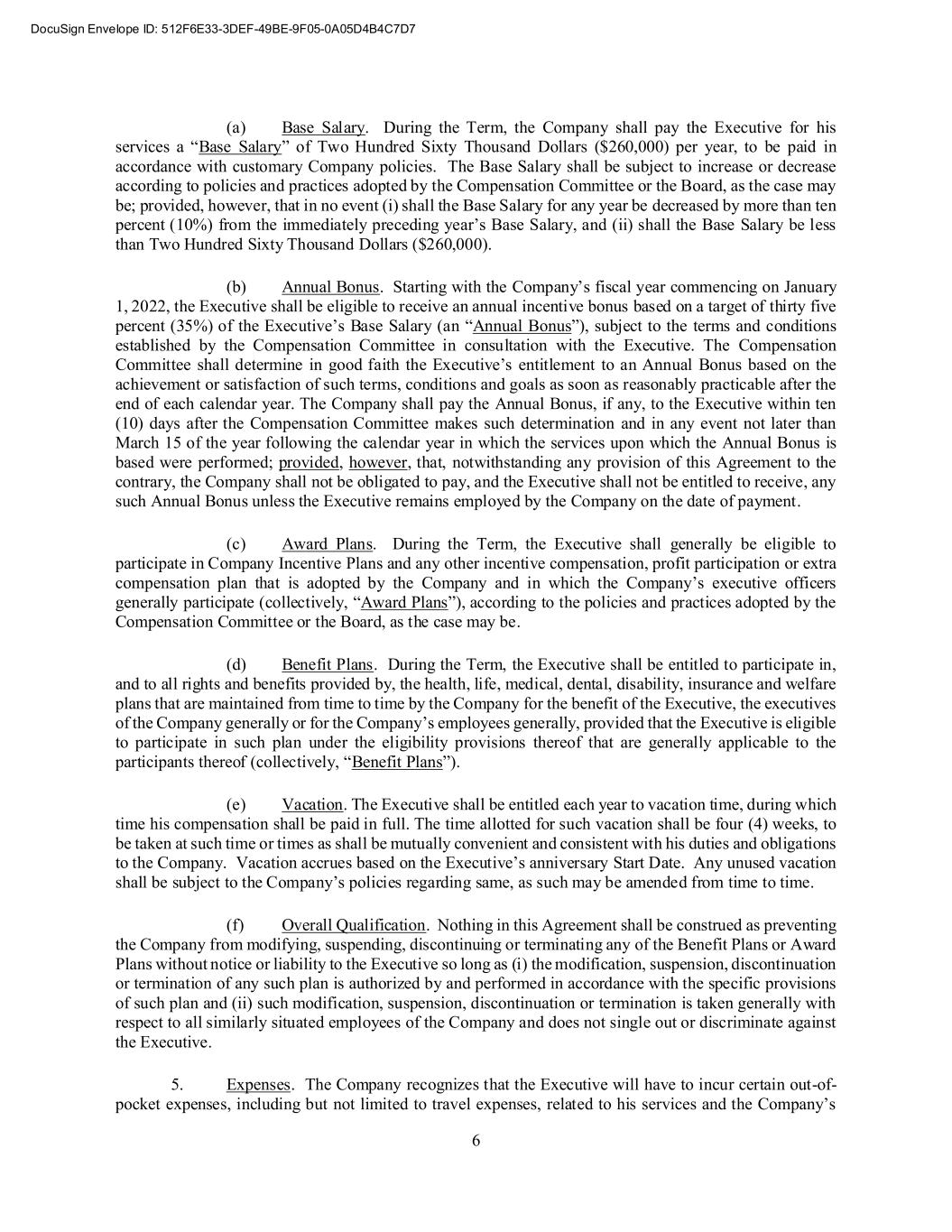 6 (a) Base Salary. During the Term, the Company shall pay the Executive for his services a “Base Salary” of Two Hundred Sixty Thousand Dollars ($260,000) per year, to be paid in accordance with customary Company policies. The Base Salary shall be subject to increase or decrease according to policies and practices adopted by the Compensation Committee or the Board, as the case may be; provided, however, that in no event (i) shall the Base Salary for any year be decreased by more than ten percent (10%) from the immediately preceding year’s Base Salary, and (ii) shall the Base Salary be less than Two Hundred Sixty Thousand Dollars ($260,000). (b) Annual Bonus. Starting with the Company’s fiscal year commencing on January 1, 2022, the Executive shall be eligible to receive an annual incentive bonus based on a target of thirty five percent (35%) of the Executive’s Base Salary (an “Annual Bonus”), subject to the terms and conditions established by the Compensation Committee in consultation with the Executive. The Compensation Committee shall determine in good faith the Executive’s entitlement to an Annual Bonus based on the achievement or satisfaction of such terms, conditions and goals as soon as reasonably practicable after the end of each calendar year. The Company shall pay the Annual Bonus, if any, to the Executive within ten (10) days after the Compensation Committee makes such determination and in any event not later than March 15 of the year following the calendar year in which the services upon which the Annual Bonus is based were performed; provided, however, that, notwithstanding any provision of this Agreement to the contrary, the Company shall not be obligated to pay, and the Executive shall not be entitled to receive, any such Annual Bonus unless the Executive remains employed by the Company on the date of payment. (c) Award Plans. During the Term, the Executive shall generally be eligible to participate in Company Incentive Plans and any other incentive compensation, profit participation or extra compensation plan that is adopted by the Company and in which the Company’s executive officers generally participate (collectively, “Award Plans”), according to the policies and practices adopted by the Compensation Committee or the Board, as the case may be. (d) Benefit Plans. During the Term, the Executive shall be entitled to participate in, and to all rights and benefits provided by, the health, life, medical, dental, disability, insurance and welfare plans that are maintained from time to time by the Company for the benefit of the Executive, the executives of the Company generally or for the Company’s employees generally, provided that the Executive is eligible to participate in such plan under the eligibility provisions thereof that are generally applicable to the participants thereof (collectively, “Benefit Plans”). (e) Vacation. The Executive shall be entitled each year to vacation time, during which time his compensation shall be paid in full. The time allotted for such vacation shall be four (4) weeks, to be taken at such time or times as shall be mutually convenient and consistent with his duties and obligations to the Company. Vacation accrues based on the Executive’s anniversary Start Date. Any unused vacation shall be subject to the Company’s policies regarding same, as such may be amended from time to time. (f) Overall Qualification. Nothing in this Agreement shall be construed as preventing the Company from modifying, suspending, discontinuing or terminating any of the Benefit Plans or Award Plans without notice or liability to the Executive so long as (i) the modification, suspension, discontinuation or termination of any such plan is authorized by and performed in accordance with the specific provisions of such plan and (ii) such modification, suspension, discontinuation or termination is taken generally with respect to all similarly situated employees of the Company and does not single out or discriminate against the Executive. 5. Expenses. The Company recognizes that the Executive will have to incur certain out-of- pocket expenses, including but not limited to travel expenses, related to his services and the Company’s