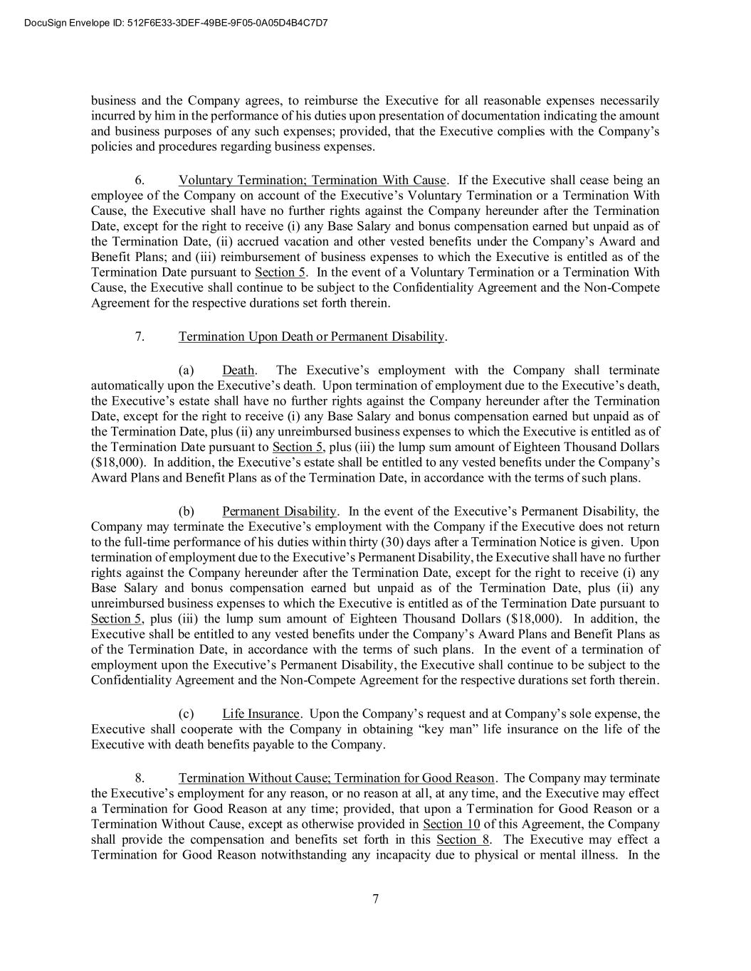 7 business and the Company agrees, to reimburse the Executive for all reasonable expenses necessarily incurred by him in the performance of his duties upon presentation of documentation indicating the amount and business purposes of any such expenses; provided, that the Executive complies with the Company’s policies and procedures regarding business expenses. 6. Voluntary Termination; Termination With Cause. If the Executive shall cease being an employee of the Company on account of the Executive’s Voluntary Termination or a Termination With Cause, the Executive shall have no further rights against the Company hereunder after the Termination Date, except for the right to receive (i) any Base Salary and bonus compensation earned but unpaid as of the Termination Date, (ii) accrued vacation and other vested benefits under the Company’s Award and Benefit Plans; and (iii) reimbursement of business expenses to which the Executive is entitled as of the Termination Date pursuant to Section 5. In the event of a Voluntary Termination or a Termination With Cause, the Executive shall continue to be subject to the Confidentiality Agreement and the Non-Compete Agreement for the respective durations set forth therein. 7. Termination Upon Death or Permanent Disability. (a) Death. The Executive’s employment with the Company shall terminate automatically upon the Executive’s death. Upon termination of employment due to the Executive’s death, the Executive’s estate shall have no further rights against the Company hereunder after the Termination Date, except for the right to receive (i) any Base Salary and bonus compensation earned but unpaid as of the Termination Date, plus (ii) any unreimbursed business expenses to which the Executive is entitled as of the Termination Date pursuant to Section 5, plus (iii) the lump sum amount of Eighteen Thousand Dollars ($18,000). In addition, the Executive’s estate shall be entitled to any vested benefits under the Company’s Award Plans and Benefit Plans as of the Termination Date, in accordance with the terms of such plans. (b) Permanent Disability. In the event of the Executive’s Permanent Disability, the Company may terminate the Executive’s employment with the Company if the Executive does not return to the full-time performance of his duties within thirty (30) days after a Termination Notice is given. Upon termination of employment due to the Executive’s Permanent Disability, the Executive shall have no further rights against the Company hereunder after the Termination Date, except for the right to receive (i) any Base Salary and bonus compensation earned but unpaid as of the Termination Date, plus (ii) any unreimbursed business expenses to which the Executive is entitled as of the Termination Date pursuant to Section 5, plus (iii) the lump sum amount of Eighteen Thousand Dollars ($18,000). In addition, the Executive shall be entitled to any vested benefits under the Company’s Award Plans and Benefit Plans as of the Termination Date, in accordance with the terms of such plans. In the event of a termination of employment upon the Executive’s Permanent Disability, the Executive shall continue to be subject to the Confidentiality Agreement and the Non-Compete Agreement for the respective durations set forth therein. (c) Life Insurance. Upon the Company’s request and at Company’s sole expense, the Executive shall cooperate with the Company in obtaining “key man” life insurance on the life of the Executive with death benefits payable to the Company. 8. Termination Without Cause; Termination for Good Reason. The Company may terminate the Executive’s employment for any reason, or no reason at all, at any time, and the Executive may effect a Termination for Good Reason at any time; provided, that upon a Termination for Good Reason or a Termination Without Cause, except as otherwise provided in Section 10 of this Agreement, the Company shall provide the compensation and benefits set forth in this Section 8. The Executive may effect a Termination for Good Reason notwithstanding any incapacity due to physical or mental illness. In the
