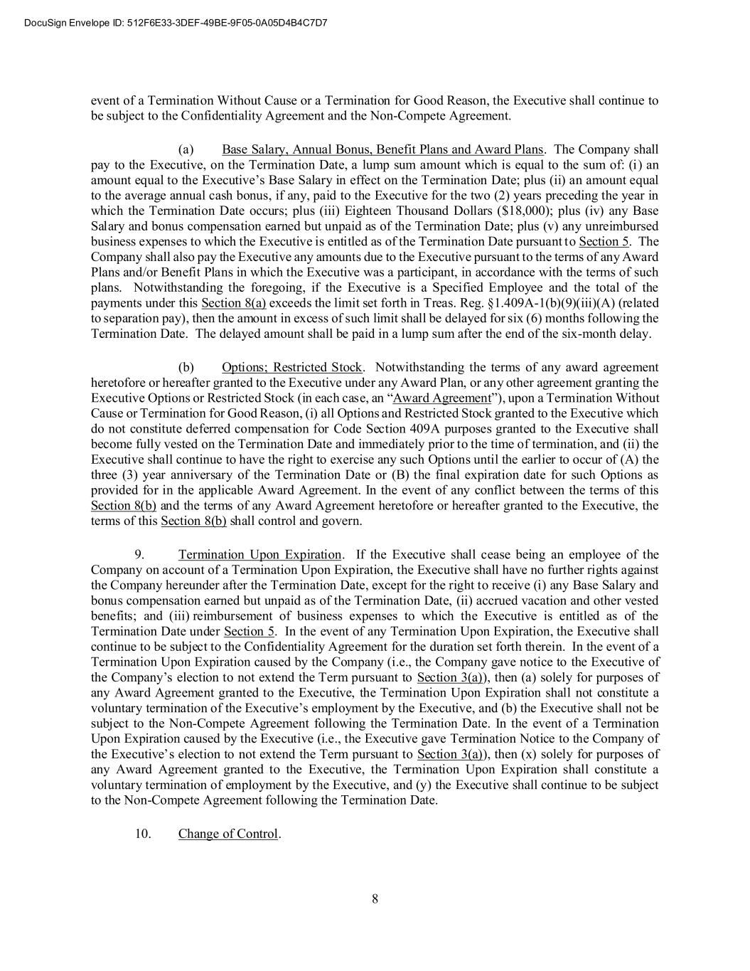 8 event of a Termination Without Cause or a Termination for Good Reason, the Executive shall continue to be subject to the Confidentiality Agreement and the Non-Compete Agreement. (a) Base Salary, Annual Bonus, Benefit Plans and Award Plans. The Company shall pay to the Executive, on the Termination Date, a lump sum amount which is equal to the sum of: (i) an amount equal to the Executive’s Base Salary in effect on the Termination Date; plus (ii) an amount equal to the average annual cash bonus, if any, paid to the Executive for the two (2) years preceding the year in which the Termination Date occurs; plus (iii) Eighteen Thousand Dollars ($18,000); plus (iv) any Base Salary and bonus compensation earned but unpaid as of the Termination Date; plus (v) any unreimbursed business expenses to which the Executive is entitled as of the Termination Date pursuant to Section 5. The Company shall also pay the Executive any amounts due to the Executive pursuant to the terms of any Award Plans and/or Benefit Plans in which the Executive was a participant, in accordance with the terms of such plans. Notwithstanding the foregoing, if the Executive is a Specified Employee and the total of the payments under this Section 8(a) exceeds the limit set forth in Treas. Reg. §1.409A-1(b)(9)(iii)(A) (related to separation pay), then the amount in excess of such limit shall be delayed for six (6) months following the Termination Date. The delayed amount shall be paid in a lump sum after the end of the six-month delay. (b) Options; Restricted Stock. Notwithstanding the terms of any award agreement heretofore or hereafter granted to the Executive under any Award Plan, or any other agreement granting the Executive Options or Restricted Stock (in each case, an “Award Agreement”), upon a Termination Without Cause or Termination for Good Reason, (i) all Options and Restricted Stock granted to the Executive which do not constitute deferred compensation for Code Section 409A purposes granted to the Executive shall become fully vested on the Termination Date and immediately prior to the time of termination, and (ii) the Executive shall continue to have the right to exercise any such Options until the earlier to occur of (A) the three (3) year anniversary of the Termination Date or (B) the final expiration date for such Options as provided for in the applicable Award Agreement. In the event of any conflict between the terms of this Section 8(b) and the terms of any Award Agreement heretofore or hereafter granted to the Executive, the terms of this Section 8(b) shall control and govern. 9. Termination Upon Expiration. If the Executive shall cease being an employee of the Company on account of a Termination Upon Expiration, the Executive shall have no further rights against the Company hereunder after the Termination Date, except for the right to receive (i) any Base Salary and bonus compensation earned but unpaid as of the Termination Date, (ii) accrued vacation and other vested benefits; and (iii) reimbursement of business expenses to which the Executive is entitled as of the Termination Date under Section 5. In the event of any Termination Upon Expiration, the Executive shall continue to be subject to the Confidentiality Agreement for the duration set forth therein. In the event of a Termination Upon Expiration caused by the Company (i.e., the Company gave notice to the Executive of the Company’s election to not extend the Term pursuant to Section 3(a)), then (a) solely for purposes of any Award Agreement granted to the Executive, the Termination Upon Expiration shall not constitute a voluntary termination of the Executive’s employment by the Executive, and (b) the Executive shall not be subject to the Non-Compete Agreement following the Termination Date. In the event of a Termination Upon Expiration caused by the Executive (i.e., the Executive gave Termination Notice to the Company of the Executive’s election to not extend the Term pursuant to Section 3(a)), then (x) solely for purposes of any Award Agreement granted to the Executive, the Termination Upon Expiration shall constitute a voluntary termination of employment by the Executive, and (y) the Executive shall continue to be subject to the Non-Compete Agreement following the Termination Date. 10. Change of Control.