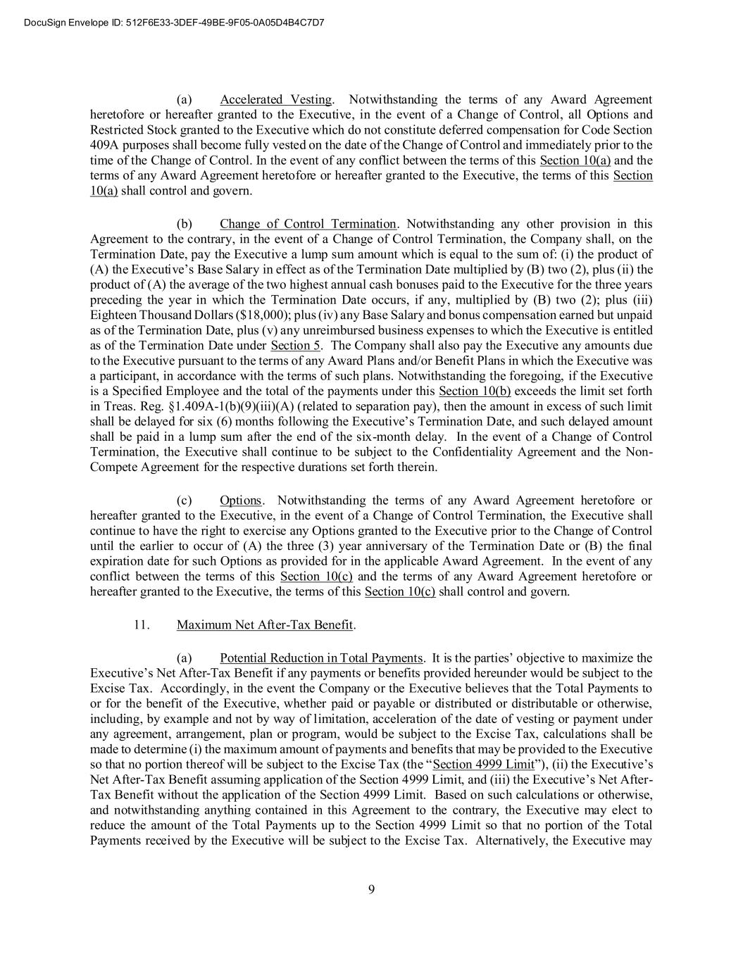 9 (a) Accelerated Vesting. Notwithstanding the terms of any Award Agreement heretofore or hereafter granted to the Executive, in the event of a Change of Control, all Options and Restricted Stock granted to the Executive which do not constitute deferred compensation for Code Section 409A purposes shall become fully vested on the date of the Change of Control and immediately prior to the time of the Change of Control. In the event of any conflict between the terms of this Section 10(a) and the terms of any Award Agreement heretofore or hereafter granted to the Executive, the terms of this Section 10(a) shall control and govern. (b) Change of Control Termination. Notwithstanding any other provision in this Agreement to the contrary, in the event of a Change of Control Termination, the Company shall, on the Termination Date, pay the Executive a lump sum amount which is equal to the sum of: (i) the product of (A) the Executive’s Base Salary in effect as of the Termination Date multiplied by (B) two (2), plus (ii) the product of (A) the average of the two highest annual cash bonuses paid to the Executive for the three years preceding the year in which the Termination Date occurs, if any, multiplied by (B) two (2); plus (iii) Eighteen Thousand Dollars ($18,000); plus (iv) any Base Salary and bonus compensation earned but unpaid as of the Termination Date, plus (v) any unreimbursed business expenses to which the Executive is entitled as of the Termination Date under Section 5. The Company shall also pay the Executive any amounts due to the Executive pursuant to the terms of any Award Plans and/or Benefit Plans in which the Executive was a participant, in accordance with the terms of such plans. Notwithstanding the foregoing, if the Executive is a Specified Employee and the total of the payments under this Section 10(b) exceeds the limit set forth in Treas. Reg. §1.409A-1(b)(9)(iii)(A) (related to separation pay), then the amount in excess of such limit shall be delayed for six (6) months following the Executive’s Termination Date, and such delayed amount shall be paid in a lump sum after the end of the six-month delay. In the event of a Change of Control Termination, the Executive shall continue to be subject to the Confidentiality Agreement and the Non- Compete Agreement for the respective durations set forth therein. (c) Options. Notwithstanding the terms of any Award Agreement heretofore or hereafter granted to the Executive, in the event of a Change of Control Termination, the Executive shall continue to have the right to exercise any Options granted to the Executive prior to the Change of Control until the earlier to occur of (A) the three (3) year anniversary of the Termination Date or (B) the final expiration date for such Options as provided for in the applicable Award Agreement. In the event of any conflict between the terms of this Section 10(c) and the terms of any Award Agreement heretofore or hereafter granted to the Executive, the terms of this Section 10(c) shall control and govern. 11. Maximum Net After-Tax Benefit. (a) Potential Reduction in Total Payments. It is the parties’ objective to maximize the Executive’s Net After-Tax Benefit if any payments or benefits provided hereunder would be subject to the Excise Tax. Accordingly, in the event the Company or the Executive believes that the Total Payments to or for the benefit of the Executive, whether paid or payable or distributed or distributable or otherwise, including, by example and not by way of limitation, acceleration of the date of vesting or payment under any agreement, arrangement, plan or program, would be subject to the Excise Tax, calculations shall be made to determine (i) the maximum amount of payments and benefits that may be provided to the Executive so that no portion thereof will be subject to the Excise Tax (the “Section 4999 Limit”), (ii) the Executive’s Net After-Tax Benefit assuming application of the Section 4999 Limit, and (iii) the Executive’s Net After- Tax Benefit without the application of the Section 4999 Limit. Based on such calculations or otherwise, and notwithstanding anything contained in this Agreement to the contrary, the Executive may elect to reduce the amount of the Total Payments up to the Section 4999 Limit so that no portion of the Total Payments received by the Executive will be subject to the Excise Tax. Alternatively, the Executive may