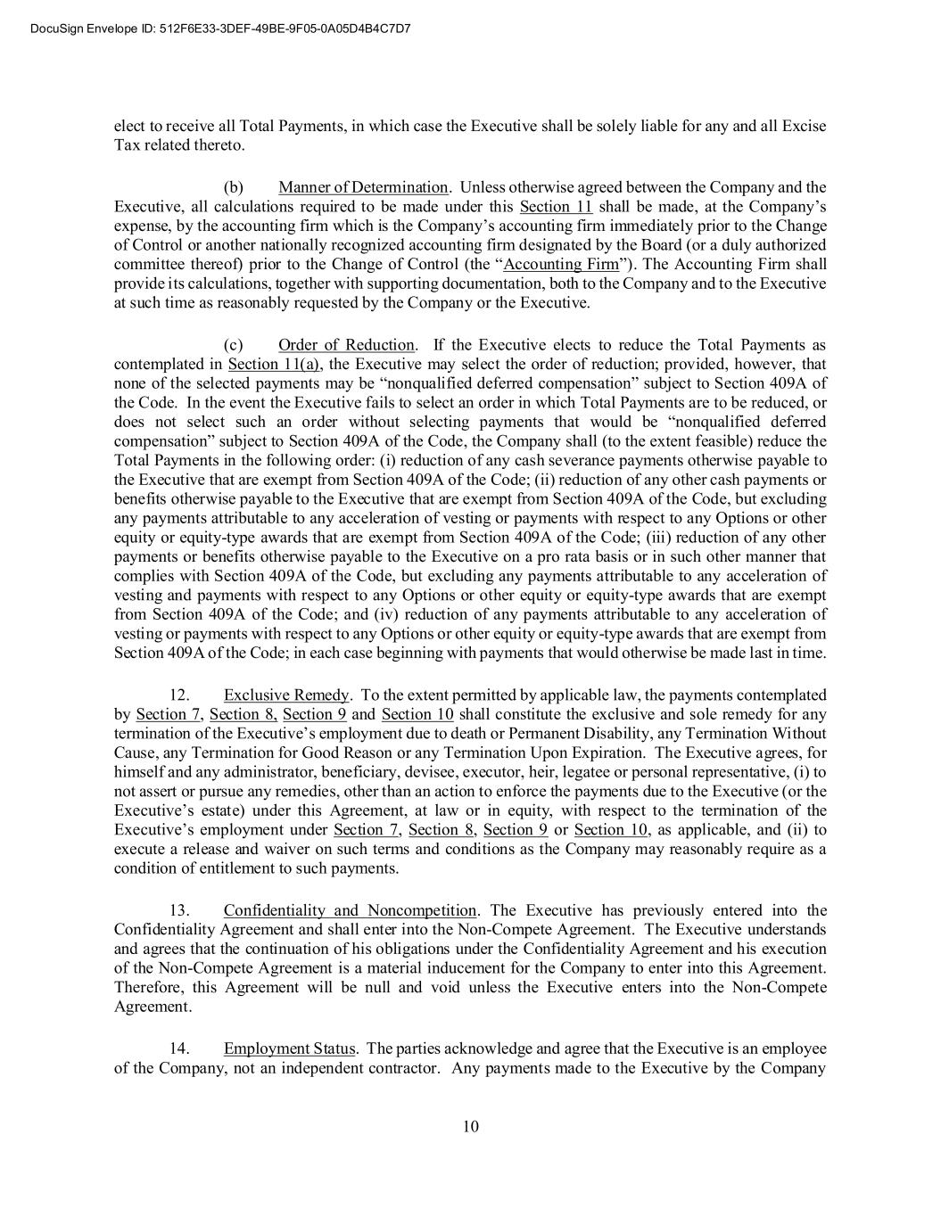 10 elect to receive all Total Payments, in which case the Executive shall be solely liable for any and all Excise Tax related thereto. (b) Manner of Determination. Unless otherwise agreed between the Company and the Executive, all calculations required to be made under this Section 11 shall be made, at the Company’s expense, by the accounting firm which is the Company’s accounting firm immediately prior to the Change of Control or another nationally recognized accounting firm designated by the Board (or a duly authorized committee thereof) prior to the Change of Control (the “Accounting Firm”). The Accounting Firm shall provide its calculations, together with supporting documentation, both to the Company and to the Executive at such time as reasonably requested by the Company or the Executive. (c) Order of Reduction. If the Executive elects to reduce the Total Payments as contemplated in Section 11(a), the Executive may select the order of reduction; provided, however, that none of the selected payments may be “nonqualified deferred compensation” subject to Section 409A of the Code. In the event the Executive fails to select an order in which Total Payments are to be reduced, or does not select such an order without selecting payments that would be “nonqualified deferred compensation” subject to Section 409A of the Code, the Company shall (to the extent feasible) reduce the Total Payments in the following order: (i) reduction of any cash severance payments otherwise payable to the Executive that are exempt from Section 409A of the Code; (ii) reduction of any other cash payments or benefits otherwise payable to the Executive that are exempt from Section 409A of the Code, but excluding any payments attributable to any acceleration of vesting or payments with respect to any Options or other equity or equity-type awards that are exempt from Section 409A of the Code; (iii) reduction of any other payments or benefits otherwise payable to the Executive on a pro rata basis or in such other manner that complies with Section 409A of the Code, but excluding any payments attributable to any acceleration of vesting and payments with respect to any Options or other equity or equity-type awards that are exempt from Section 409A of the Code; and (iv) reduction of any payments attributable to any acceleration of vesting or payments with respect to any Options or other equity or equity-type awards that are exempt from Section 409A of the Code; in each case beginning with payments that would otherwise be made last in time. 12. Exclusive Remedy. To the extent permitted by applicable law, the payments contemplated by Section 7, Section 8, Section 9 and Section 10 shall constitute the exclusive and sole remedy for any termination of the Executive’s employment due to death or Permanent Disability, any Termination Without Cause, any Termination for Good Reason or any Termination Upon Expiration. The Executive agrees, for himself and any administrator, beneficiary, devisee, executor, heir, legatee or personal representative, (i) to not assert or pursue any remedies, other than an action to enforce the payments due to the Executive (or the Executive’s estate) under this Agreement, at law or in equity, with respect to the termination of the Executive’s employment under Section 7, Section 8, Section 9 or Section 10, as applicable, and (ii) to execute a release and waiver on such terms and conditions as the Company may reasonably require as a condition of entitlement to such payments. 13. Confidentiality and Noncompetition. The Executive has previously entered into the Confidentiality Agreement and shall enter into the Non-Compete Agreement. The Executive understands and agrees that the continuation of his obligations under the Confidentiality Agreement and his execution of the Non-Compete Agreement is a material inducement for the Company to enter into this Agreement. Therefore, this Agreement will be null and void unless the Executive enters into the Non-Compete Agreement. 14. Employment Status. The parties acknowledge and agree that the Executive is an employee of the Company, not an independent contractor. Any payments made to the Executive by the Company