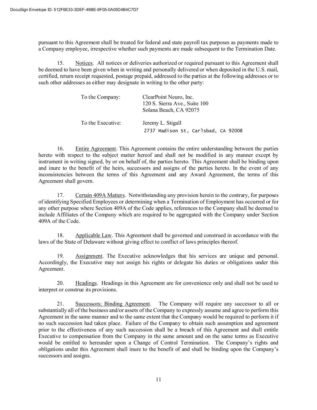 11 pursuant to this Agreement shall be treated for federal and state payroll tax purposes as payments made to a Company employee, irrespective whether such payments are made subsequent to the Termination Date. 15. Notices. All notices or deliveries authorized or required pursuant to this Agreement shall be deemed to have been given when in writing and personally delivered or when deposited in the U.S. mail, certified, return receipt requested, postage prepaid, addressed to the parties at the following addresses or to such other addresses as either may designate in writing to the other party: To the Company: ClearPoint Neuro, Inc. 120 S. Sierra Ave., Suite 100 Solana Beach, CA 92075 To the Executive: Jeremy L. Stigall 16. Entire Agreement. This Agreement contains the entire understanding between the parties hereto with respect to the subject matter hereof and shall not be modified in any manner except by instrument in writing signed, by or on behalf of, the parties hereto. This Agreement shall be binding upon and inure to the benefit of the heirs, successors and assigns of the parties hereto. In the event of any inconsistencies between the terms of this Agreement and any Award Agreement, the terms of this Agreement shall govern. 17. Certain 409A Matters. Notwithstanding any provision herein to the contrary, for purposes of identifying Specified Employees or determining when a Termination of Employment has occurred or for any other purpose where Section 409A of the Code applies, references to the Company shall be deemed to include Affiliates of the Company which are required to be aggregated with the Company under Section 409A of the Code. 18. Applicable Law. This Agreement shall be governed and construed in accordance with the laws of the State of Delaware without giving effect to conflict of laws principles thereof. 19. Assignment. The Executive acknowledges that his services are unique and personal. Accordingly, the Executive may not assign his rights or delegate his duties or obligations under this Agreement. 20. Headings. Headings in this Agreement are for convenience only and shall not be used to interpret or construe its provisions. 21. Successors; Binding Agreement. The Company will require any successor to all or substantially all of the business and/or assets of the Company to expressly assume and agree to perform this Agreement in the same manner and to the same extent that the Company would be required to perform it if no such succession had taken place. Failure of the Company to obtain such assumption and agreement prior to the effectiveness of any such succession shall be a breach of this Agreement and shall entitle Executive to compensation from the Company in the same amount and on the same terms as Executive would be entitled to hereunder upon a Change of Control Termination. The Company’s rights and obligations under this Agreement shall inure to the benefit of and shall be binding upon the Company’s successors and assigns.
