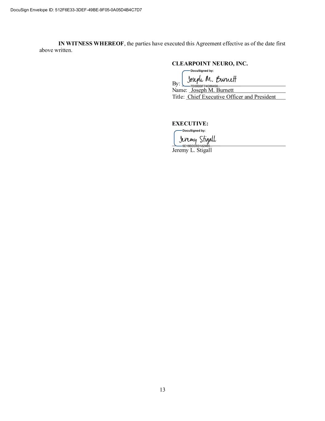 13 IN WITNESS WHEREOF, the parties have executed this Agreement effective as of the date first above written. CLEARPOINT NEURO, INC. By: Name: Joseph M. Burnett Title: Chief Executive Officer and President EXECUTIVE: Jeremy L. Stigall