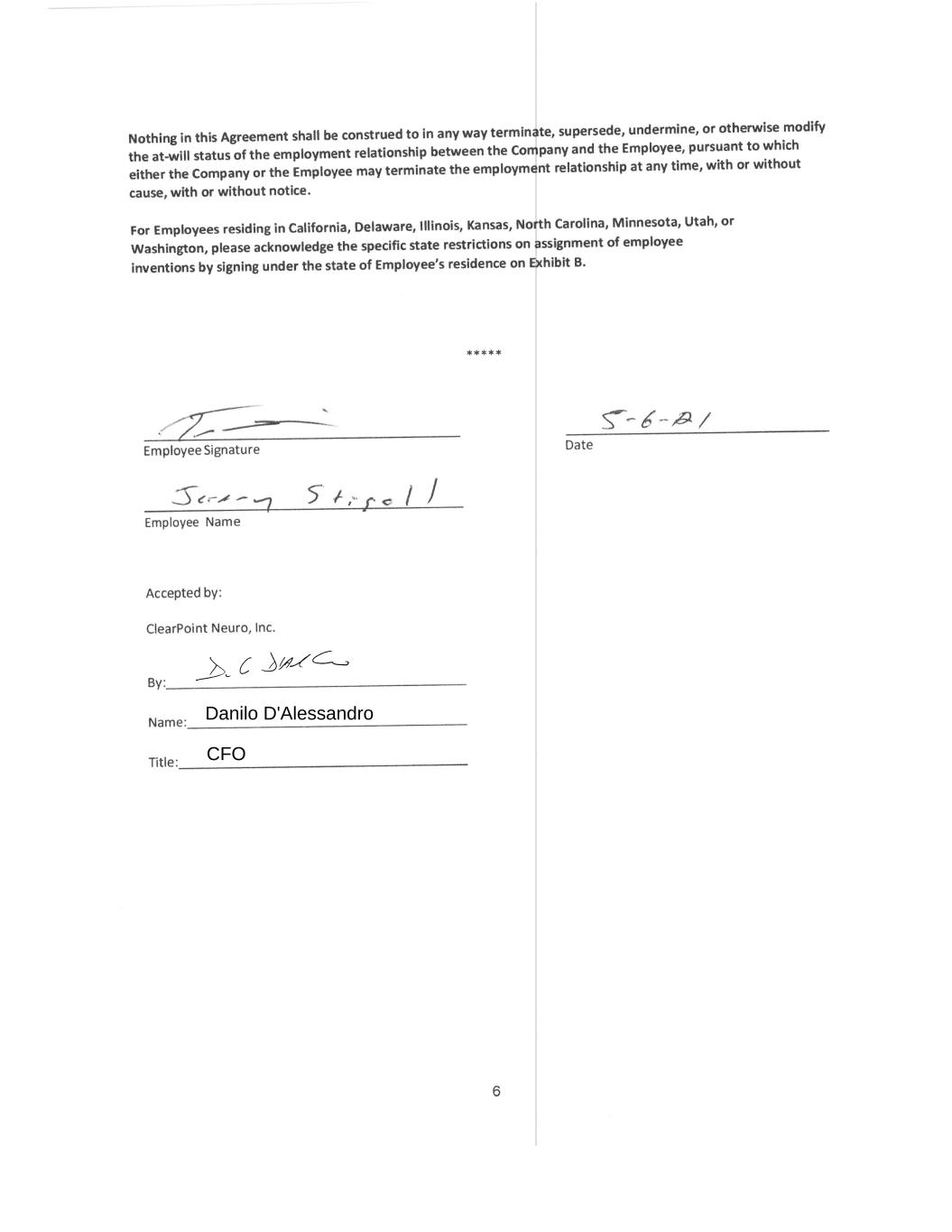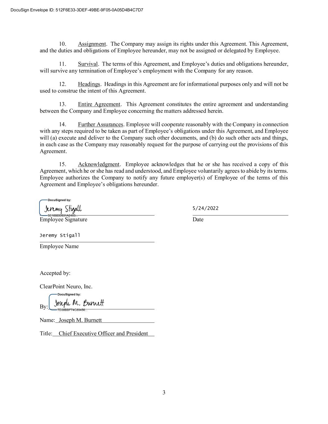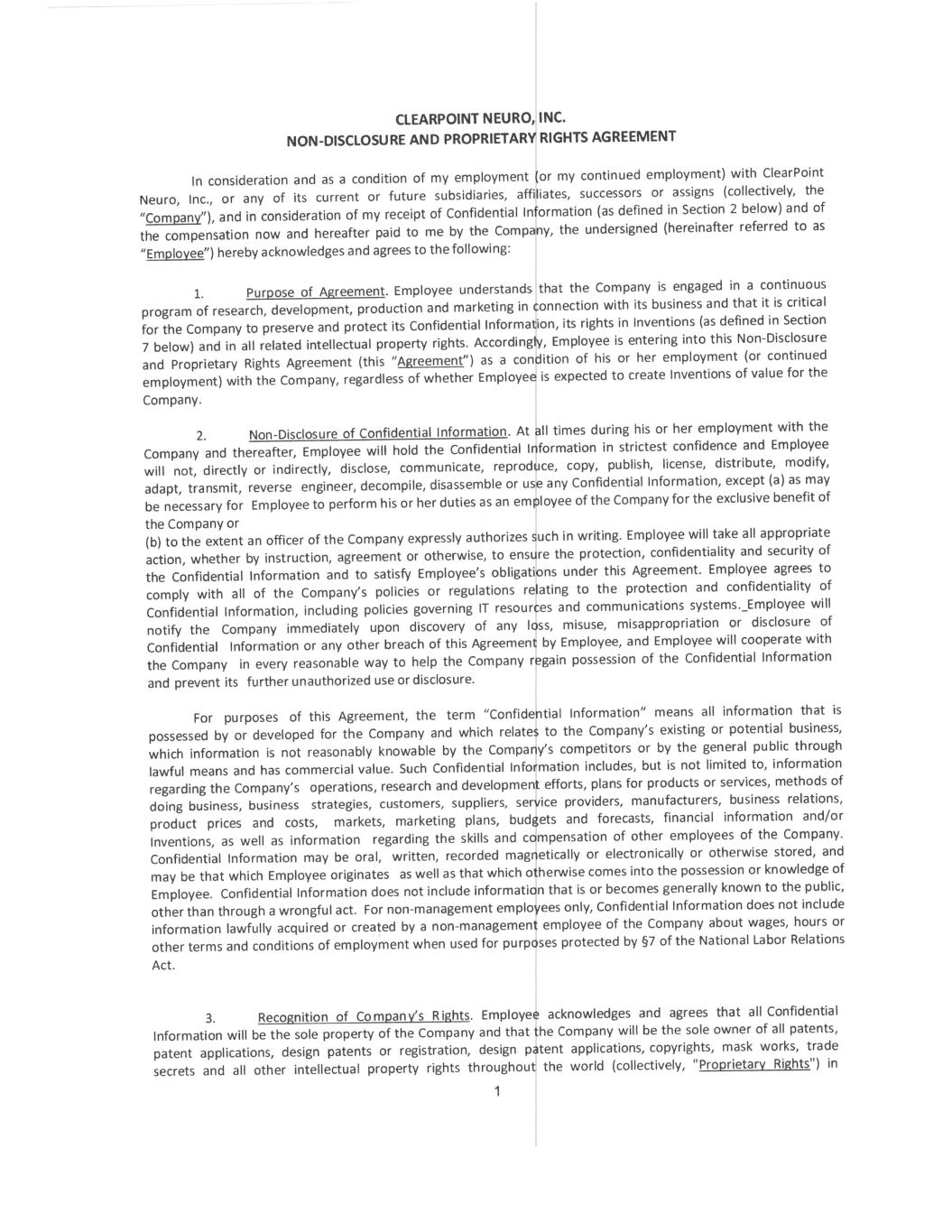 3 10. Assignment. The Company may assign its rights under this Agreement. This Agreement, and the duties and obligations of Employee hereunder, may not be assigned or delegated by Employee. 11. Survival. The terms of this Agreement, and Employee’s duties and obligations hereunder, will survive any termination of Employee’s employment with the Company for any reason. 12. Headings. Headings in this Agreement are for informational purposes only and will not be used to construe the intent of this Agreement. 13. Entire Agreement. This Agreement constitutes the entire agreement and understanding between the Company and Employee concerning the matters addressed herein. 14. Further Assurances. Employee will cooperate reasonably with the Company in connection with any steps required to be taken as part of Employee’s obligations under this Agreement, and Employee will (a) execute and deliver to the Company such other documents, and (b) do such other acts and things, in each case as the Company may reasonably request for the purpose of carrying out the provisions of this Agreement. 15. Acknowledgment. Employee acknowledges that he or she has received a copy of this Agreement, which he or she has read and understood, and Employee voluntarily agrees to abide by its terms. Employee authorizes the Company to notify any future employer(s) of Employee of the terms of this Agreement and Employee’s obligations hereunder. Employee Signature Date Employee Name Accepted by: ClearPoint Neuro, Inc. By: Name: Joseph M. Burnett Title: Chief Executive Officer and President