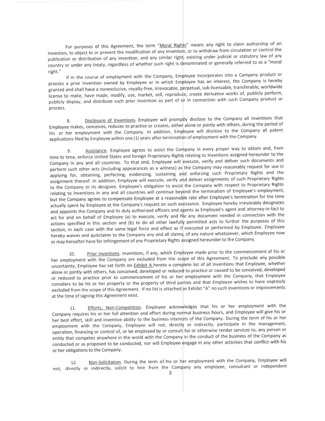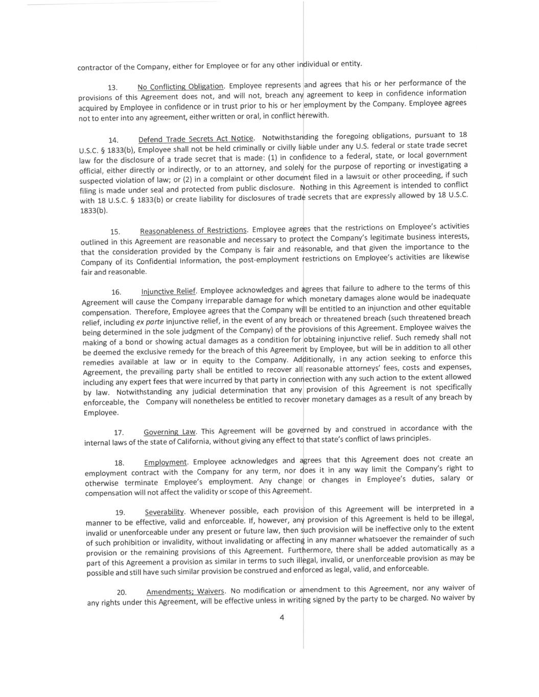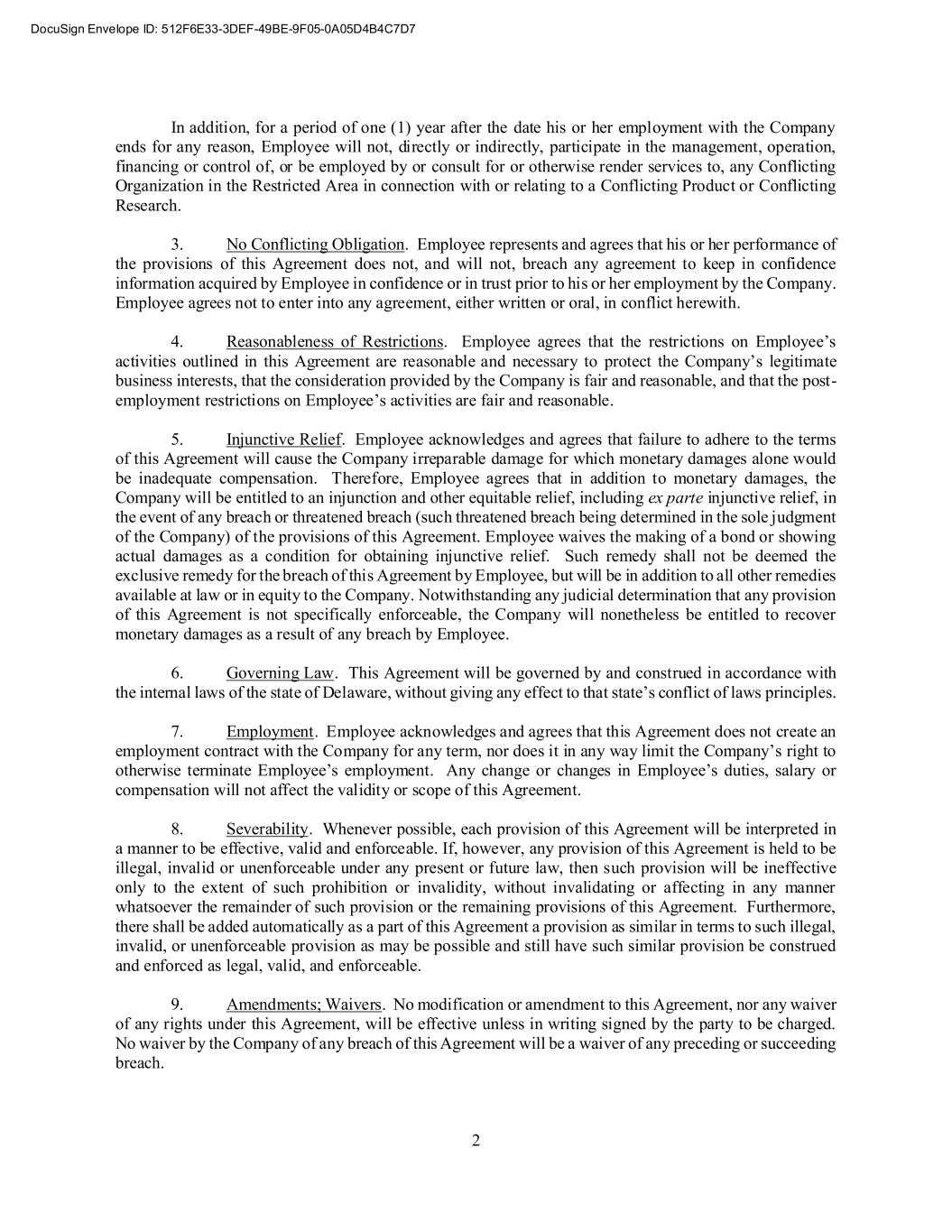 2 In addition, for a period of one (1) year after the date his or her employment with the Company ends for any reason, Employee will not, directly or indirectly, participate in the management, operation, financing or control of, or be employed by or consult for or otherwise render services to, any Conflicting Organization in the Restricted Area in connection with or relating to a Conflicting Product or Conflicting Research. 3. No Conflicting Obligation. Employee represents and agrees that his or her performance of the provisions of this Agreement does not, and will not, breach any agreement to keep in confidence information acquired by Employee in confidence or in trust prior to his or her employment by the Company. Employee agrees not to enter into any agreement, either written or oral, in conflict herewith. 4. Reasonableness of Restrictions. Employee agrees that the restrictions on Employee’s activities outlined in this Agreement are reasonable and necessary to protect the Company’s legitimate business interests, that the consideration provided by the Company is fair and reasonable, and that the post- employment restrictions on Employee’s activities are fair and reasonable. 5. Injunctive Relief. Employee acknowledges and agrees that failure to adhere to the terms of this Agreement will cause the Company irreparable damage for which monetary damages alone would be inadequate compensation. Therefore, Employee agrees that in addition to monetary damages, the Company will be entitled to an injunction and other equitable relief, including ex parte injunctive relief, in the event of any breach or threatened breach (such threatened breach being determined in the sole judgment of the Company) of the provisions of this Agreement. Employee waives the making of a bond or showing actual damages as a condition for obtaining injunctive relief. Such remedy shall not be deemed the exclusive remedy for the breach of this Agreement by Employee, but will be in addition to all other remedies available at law or in equity to the Company. Notwithstanding any judicial determination that any provision of this Agreement is not specifically enforceable, the Company will nonetheless be entitled to recover monetary damages as a result of any breach by Employee. 6. Governing Law. This Agreement will be governed by and construed in accordance with the internal laws of the state of Delaware, without giving any effect to that state’s conflict of laws principles. 7. Employment. Employee acknowledges and agrees that this Agreement does not create an employment contract with the Company for any term, nor does it in any way limit the Company’s right to otherwise terminate Employee’s employment. Any change or changes in Employee’s duties, salary or compensation will not affect the validity or scope of this Agreement. 8. Severability. Whenever possible, each provision of this Agreement will be interpreted in a manner to be effective, valid and enforceable. If, however, any provision of this Agreement is held to be illegal, invalid or unenforceable under any present or future law, then such provision will be ineffective only to the extent of such prohibition or invalidity, without invalidating or affecting in any manner whatsoever the remainder of such provision or the remaining provisions of this Agreement. Furthermore, there shall be added automatically as a part of this Agreement a provision as similar in terms to such illegal, invalid, or unenforceable provision as may be possible and still have such similar provision be construed and enforced as legal, valid, and enforceable. 9. Amendments; Waivers. No modification or amendment to this Agreement, nor any waiver of any rights under this Agreement, will be effective unless in writing signed by the party to be charged. No waiver by the Company of any breach of this Agreement will be a waiver of any preceding or succeeding breach.
