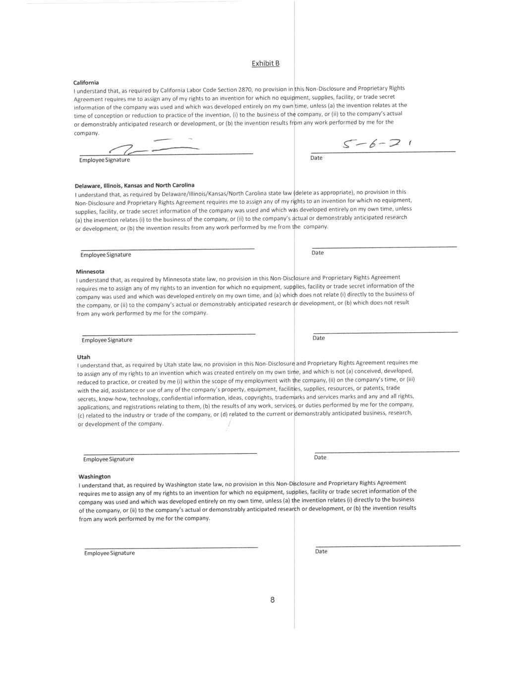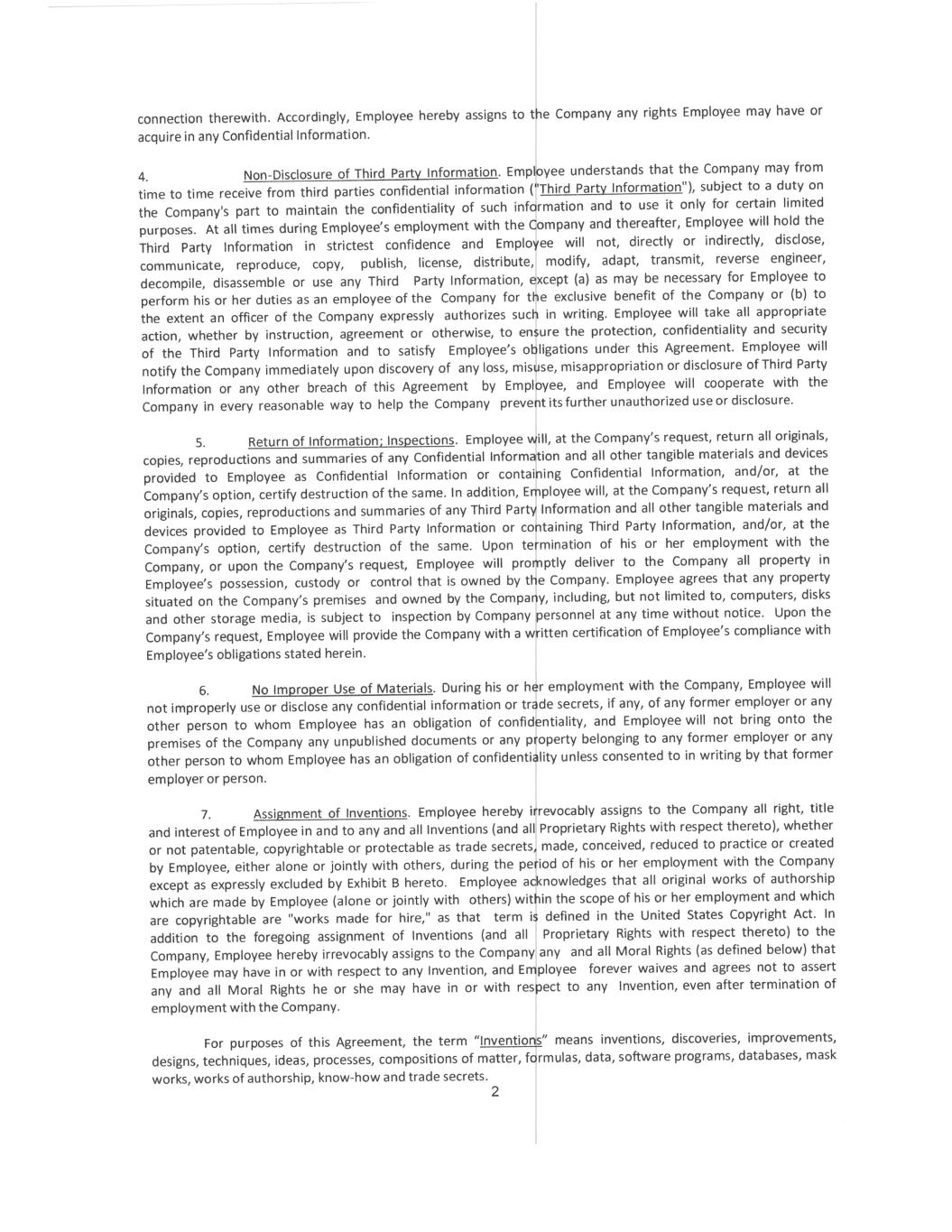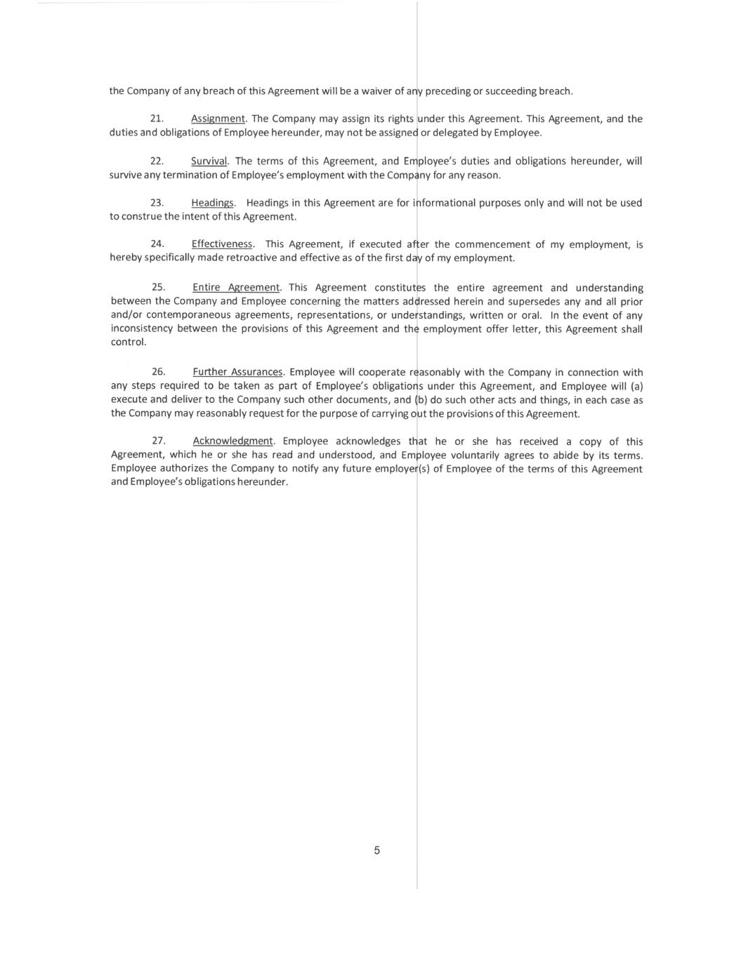 2 In addition, for a period of one (1) year after the date his or her employment with the Company ends for any reason, Employee will not, directly or indirectly, participate in the management, operation, financing or control of, or be employed by or consult for or otherwise render services to, any Conflicting Organization in the Restricted Area in connection with or relating to a Conflicting Product or Conflicting Research. 3. No Conflicting Obligation. Employee represents and agrees that his or her performance of the provisions of this Agreement does not, and will not, breach any agreement to keep in confidence information acquired by Employee in confidence or in trust prior to his or her employment by the Company. Employee agrees not to enter into any agreement, either written or oral, in conflict herewith. 4. Reasonableness of Restrictions. Employee agrees that the restrictions on Employee’s activities outlined in this Agreement are reasonable and necessary to protect the Company’s legitimate business interests, that the consideration provided by the Company is fair and reasonable, and that the post- employment restrictions on Employee’s activities are fair and reasonable. 5. Injunctive Relief. Employee acknowledges and agrees that failure to adhere to the terms of this Agreement will cause the Company irreparable damage for which monetary damages alone would be inadequate compensation. Therefore, Employee agrees that in addition to monetary damages, the Company will be entitled to an injunction and other equitable relief, including ex parte injunctive relief, in the event of any breach or threatened breach (such threatened breach being determined in the sole judgment of the Company) of the provisions of this Agreement. Employee waives the making of a bond or showing actual damages as a condition for obtaining injunctive relief. Such remedy shall not be deemed the exclusive remedy for the breach of this Agreement by Employee, but will be in addition to all other remedies available at law or in equity to the Company. Notwithstanding any judicial determination that any provision of this Agreement is not specifically enforceable, the Company will nonetheless be entitled to recover monetary damages as a result of any breach by Employee. 6. Governing Law. This Agreement will be governed by and construed in accordance with the internal laws of the state of Delaware, without giving any effect to that state’s conflict of laws principles. 7. Employment. Employee acknowledges and agrees that this Agreement does not create an employment contract with the Company for any term, nor does it in any way limit the Company’s right to otherwise terminate Employee’s employment. Any change or changes in Employee’s duties, salary or compensation will not affect the validity or scope of this Agreement. 8. Severability. Whenever possible, each provision of this Agreement will be interpreted in a manner to be effective, valid and enforceable. If, however, any provision of this Agreement is held to be illegal, invalid or unenforceable under any present or future law, then such provision will be ineffective only to the extent of such prohibition or invalidity, without invalidating or affecting in any manner whatsoever the remainder of such provision or the remaining provisions of this Agreement. Furthermore, there shall be added automatically as a part of this Agreement a provision as similar in terms to such illegal, invalid, or unenforceable provision as may be possible and still have such similar provision be construed and enforced as legal, valid, and enforceable. 9. Amendments; Waivers. No modification or amendment to this Agreement, nor any waiver of any rights under this Agreement, will be effective unless in writing signed by the party to be charged. No waiver by the Company of any breach of this Agreement will be a waiver of any preceding or succeeding breach.