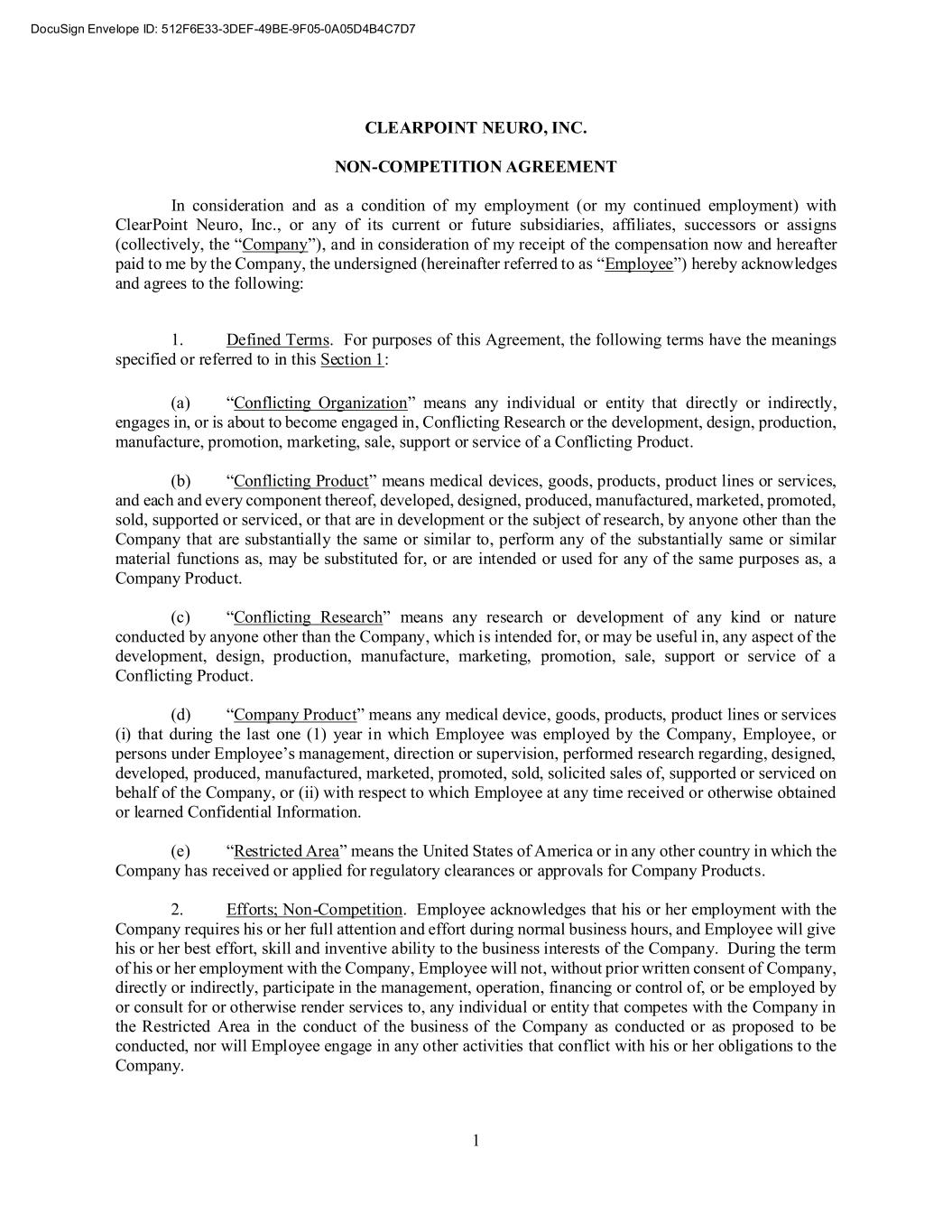 1 CLEARPOINT NEURO, INC. NON-COMPETITION AGREEMENT In consideration and as a condition of my employment (or my continued employment) with ClearPoint Neuro, Inc., or any of its current or future subsidiaries, affiliates, successors or assigns (collectively, the “Company”), and in consideration of my receipt of the compensation now and hereafter paid to me by the Company, the undersigned (hereinafter referred to as “Employee”) hereby acknowledges and agrees to the following: 1. Defined Terms. For purposes of this Agreement, the following terms have the meanings specified or referred to in this Section 1: (a) “Conflicting Organization” means any individual or entity that directly or indirectly, engages in, or is about to become engaged in, Conflicting Research or the development, design, production, manufacture, promotion, marketing, sale, support or service of a Conflicting Product. (b) “Conflicting Product” means medical devices, goods, products, product lines or services, and each and every component thereof, developed, designed, produced, manufactured, marketed, promoted, sold, supported or serviced, or that are in development or the subject of research, by anyone other than the Company that are substantially the same or similar to, perform any of the substantially same or similar material functions as, may be substituted for, or are intended or used for any of the same purposes as, a Company Product. (c) “Conflicting Research” means any research or development of any kind or nature conducted by anyone other than the Company, which is intended for, or may be useful in, any aspect of the development, design, production, manufacture, marketing, promotion, sale, support or service of a Conflicting Product. (d) “Company Product” means any medical device, goods, products, product lines or services (i) that during the last one (1) year in which Employee was employed by the Company, Employee, or persons under Employee’s management, direction or supervision, performed research regarding, designed, developed, produced, manufactured, marketed, promoted, sold, solicited sales of, supported or serviced on behalf of the Company, or (ii) with respect to which Employee at any time received or otherwise obtained or learned Confidential Information. (e) “Restricted Area” means the United States of America or in any other country in which the Company has received or applied for regulatory clearances or approvals for Company Products. 2. Efforts; Non-Competition. Employee acknowledges that his or her employment with the Company requires his or her full attention and effort during normal business hours, and Employee will give his or her best effort, skill and inventive ability to the business interests of the Company. During the term of his or her employment with the Company, Employee will not, without prior written consent of Company, directly or indirectly, participate in the management, operation, financing or control of, or be employed by or consult for or otherwise render services to, any individual or entity that competes with the Company in the Restricted Area in the conduct of the business of the Company as conducted or as proposed to be conducted, nor will Employee engage in any other activities that conflict with his or her obligations to the Company.