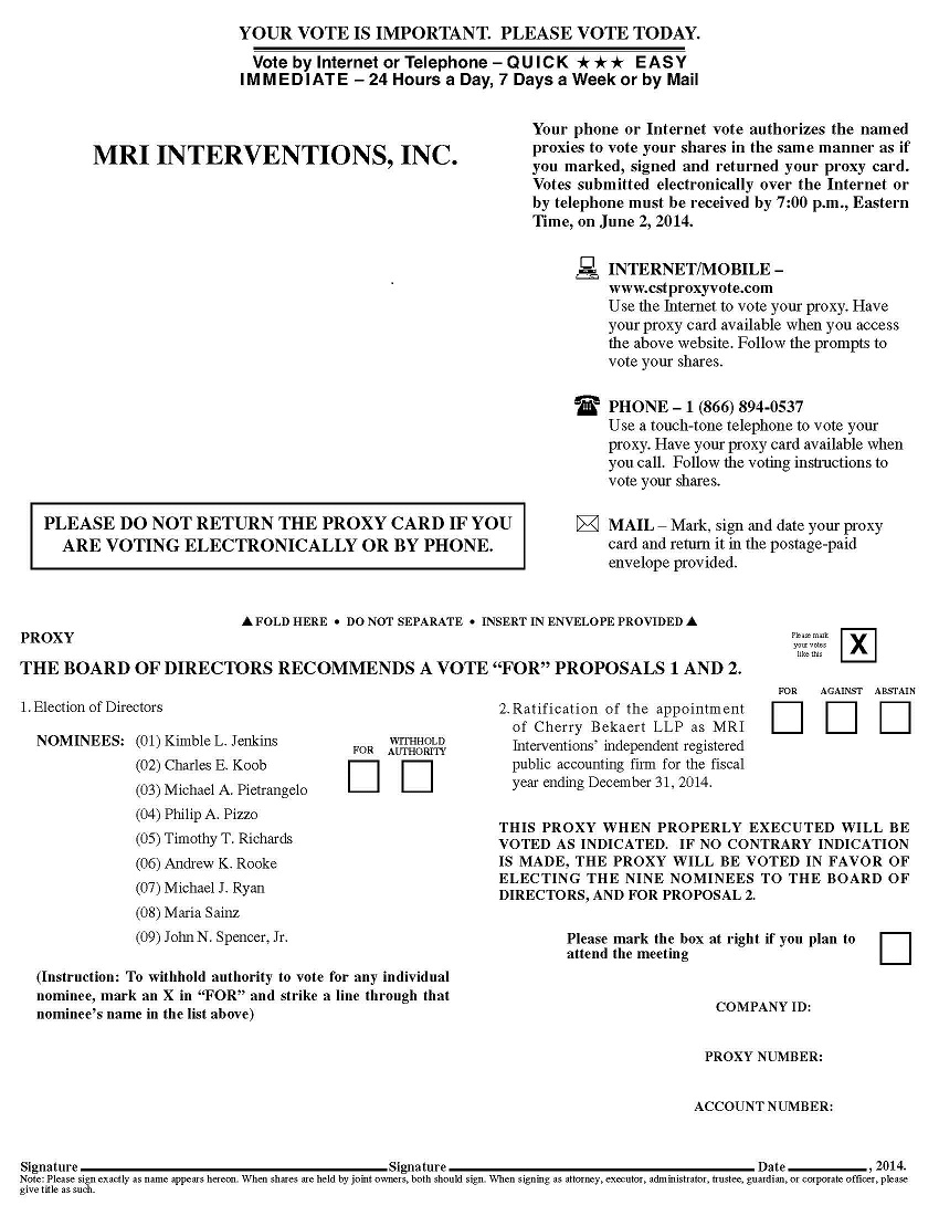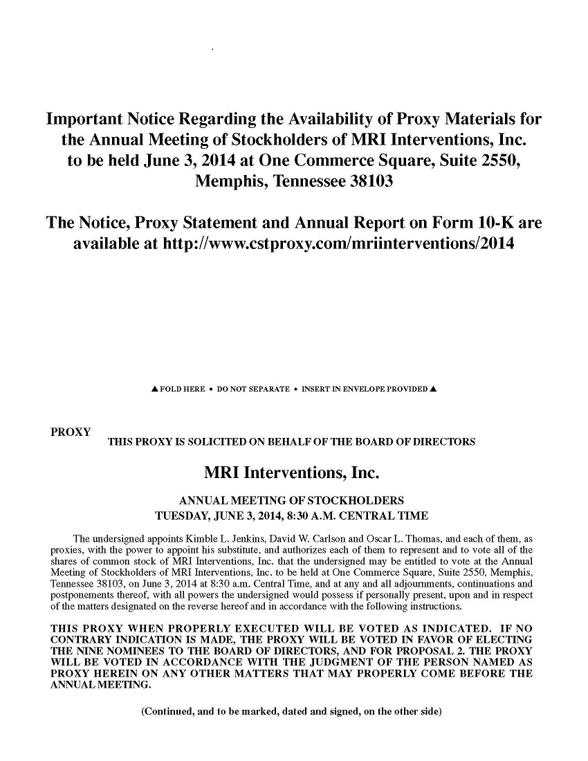 With this letter, we have enclosed a copy of our Annual Report on Form 10-K for the year ended December 31, 2013, Notice of Annual Meeting of Stockholders, Proxy Statement and Proxy Card. These materials provide further information about our Annual Meeting. If you would like another copy of the Annual Report, please send your request to our Investor Relations Department, MRI Interventions, Inc., One Commerce Square, Suite 2550, Memphis, Tennessee 38103, and one will be mailed to you. It is also available on the Internet at www.cstproxy.com/mriinterventions/2014.