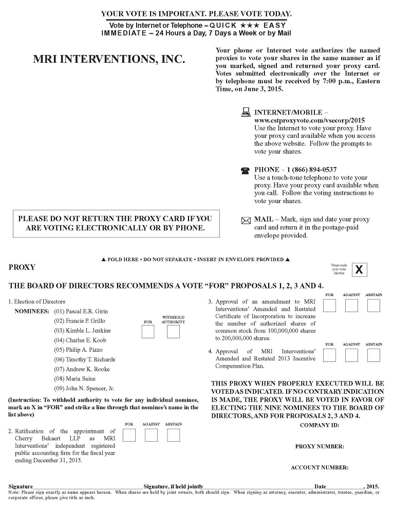With this letter, we have enclosed a copy of our Annual Report on Form 10-K for the year ended December 31, 2014, Notice of Annual Meeting of Stockholders, Proxy Statement and Proxy Card. These materials provide further information about our Annual Meeting. If you would like another copy of the Annual Report, please send your request to MRI Interventions, Inc., Attn: Investor Relations, 5 Musick, Irvine, California 92618, and one will be mailed to you. It is also available on the Internet at www.cstproxy.com/mriinterventions/2015.
