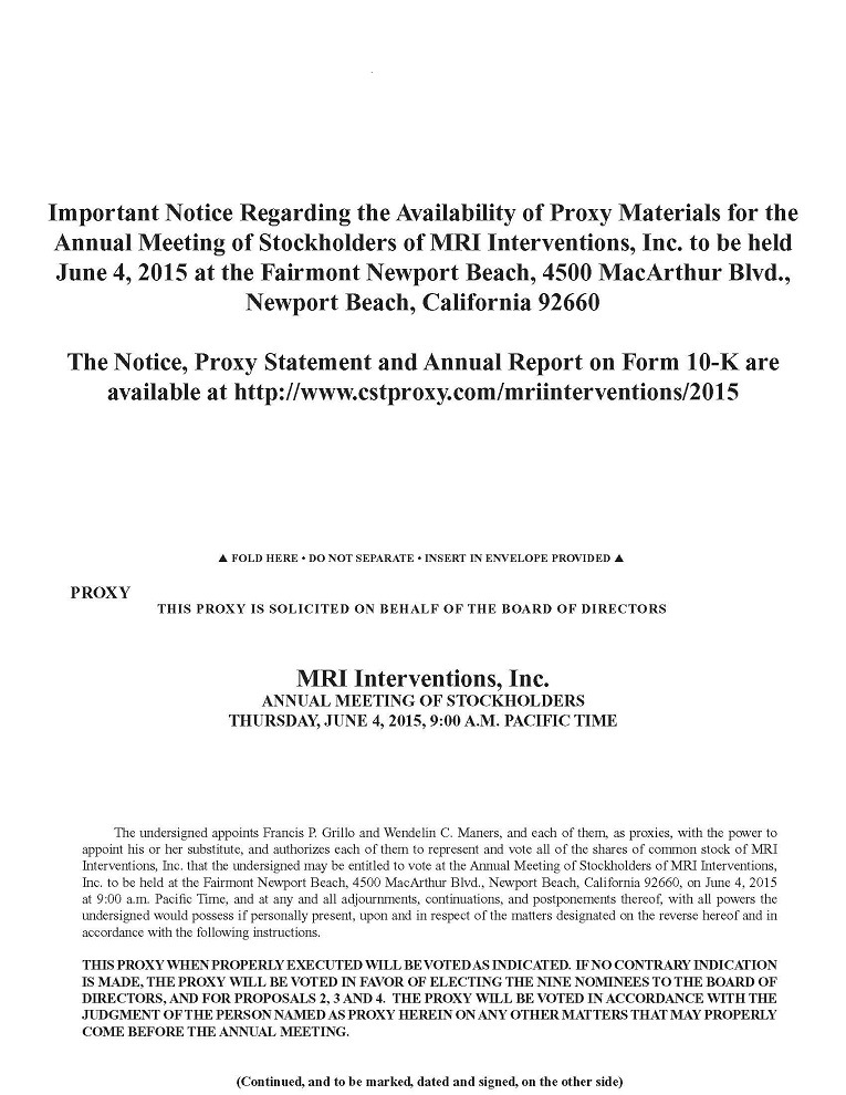 You are cordially invited to attend the Annual Meeting of Stockholders of MRI Interventions, Inc. to be held on Thursday, June 4, 2015 at 9:00 a.m., Pacific Time, at the Fairmont Newport Beach, 4500 MacArthur Blvd., Newport Beach, California 92660.