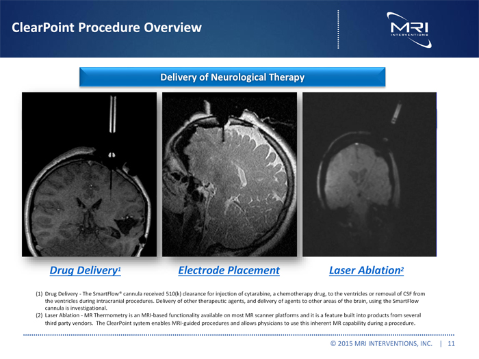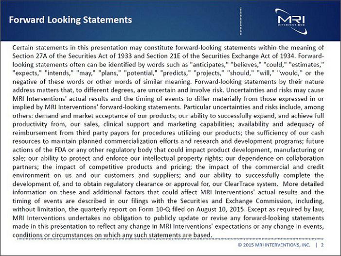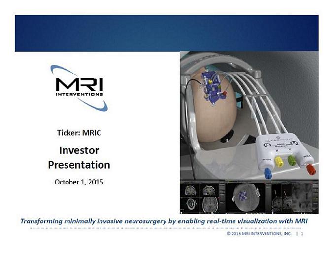 Ticker: MRIC Investor Presentation September, 2015 Transforming minimally invasive neurosurgery by enabling real-time visualization with MRI 2015 MRI INTERVENTIONS, INC. | 1 |