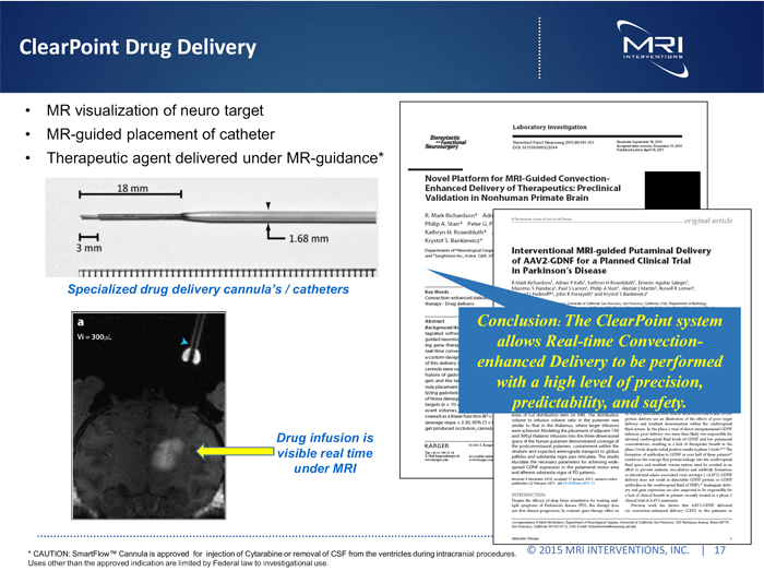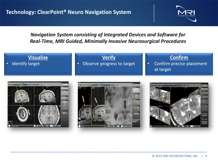 Technology: ClearPoint® Neuro Navigation System Navigation System consisting of Integrated Devices and Software for Real-Time, MRI Guided, Minimally Invasive Neurosurgical Procedures Visualize Identify target Verify Observe progress to target Confirm Confirm precise placement at target © 2015 MRI INTERVENTIONS, INC. | 6 |