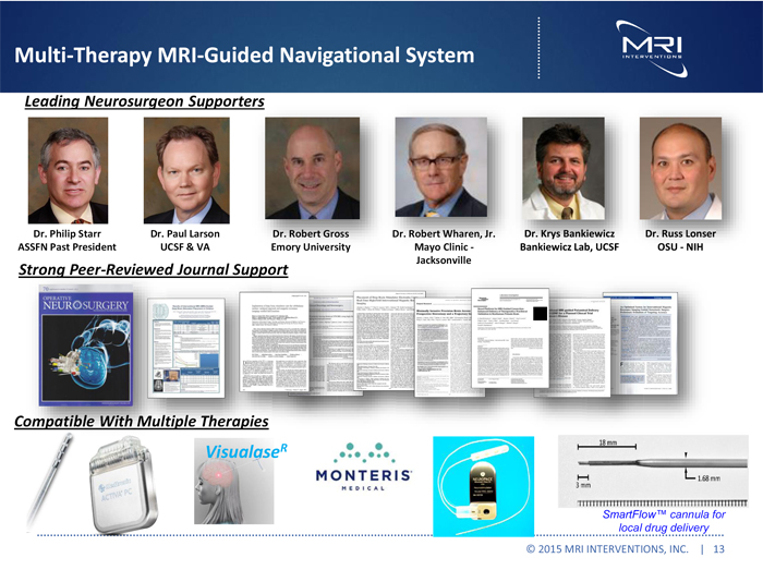 ClearPoint Hospital Economics Increase Patients Better patient experience provides hospitals the opportunity to reach additional patient populations that may otherwise forego surgery 65% of eligible DBS patients refuse treatment, due to fear of surgery(1) Established, Attractive Reimbursement Move procedures from the more expensive OR to the less expensive MR suite, with equivalent reimbursement Improved Utilization of Existing MRI's 1 hour of MR Scanner time used for diagnostic imaging could generate $1,200(2) 1 hour of MR scanner time used for a ClearPoint procedure could generate $5,275(3) Utilizes existing MRI's already in hospital (1) Medtronic Investor Presentation, June, 2014 (2) Estimated average US hospital-based MRI suite revenue per hour for outpatient diagnostic scans, based on data gathered by MRI Interventions. Excludes professional fees. Actual revenues will vary by hospital, procedure and payor. (3) Based on a weighted average payment to MRI Interventions' customers (as of September 2014) for an electrode placement procedure for Medicare and private insurance patients, calculated by MRI Interventions using a payor mix weighted 67% to average Medicare reimbursement and 33% to average private insurance reimbursement. Average Medicare reimbursement calculated as the weighted average Medicare payment for MRI Interventions' customers (as of September 2014) for an electrode placement procedure under MS-DRGs 025, 026 and 027. Average private insurance reimbursement calculated as 1.5x Medicare reimbursement, based on published data. Hourly amount assumes 4.5 hour procedure duration. Excludes professional fees. Actual revenues will vary by hospital, procedure and payor. © 2015 MRI INTERVENTIONS, INC. | 12 |