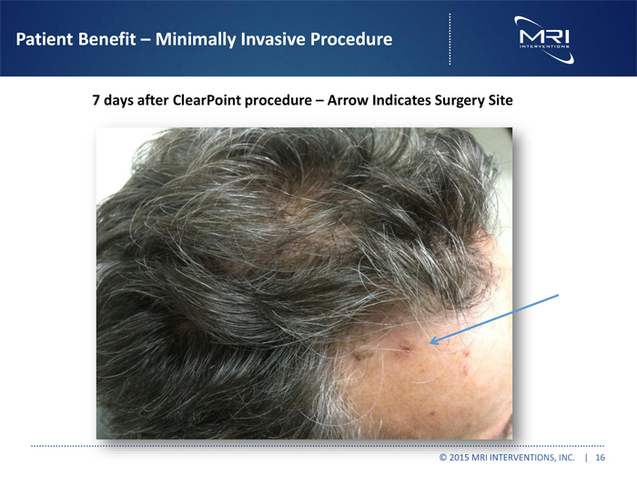 Patient Benefit - Minimally Invasive Procedure 7 days after ClearPoint procedure - Arrow Indicates Surgery Site © 2015 MRI INTERVENTIONS, INC. | 16 |