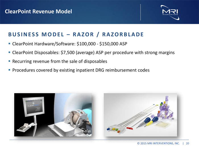 The ClearPoint Difference Without ClearPoint (Stereotactic) No direct visualization; Performed in an operating room Patient may be awake for own brain surgery(1) Long procedures - Can be up to 8 hours Accuracy to target based on prior images May require OR and MRI for same procedure (laser ablation) Poor economics for hospital and physician With ClearPoint Direct, high resolution visualization; Performed in an MRI Suite Patient may be under general anesthesia(1) Shorter procedures - Can be 3 hours or less Highly accurate, based on real time images One procedure, one place Attractive economics for hospital and physician Better for Patients Better for Surgeons Better for Hospitals (1) Microelectrode recording and macrostim are processes that involve listening to neuronal firings (i.e., physiological recordings) and observing physiological responses to stimuli during brain surgery. In connection with our 510(k) clearance in 2010, the FDA requested a warning within ClearPoint's Instructions for Use based on the lack of data with respect to deep brain stimulation (DBS) procedures. The warning states that the ClearPoint system, alone, should not be used to guide a DBS lead to a specific brain target and that final placement of DBS leads requires physiological recordings to confirm that they are located in the correct brain target and functioning as intended. © 2015 MRI INTERVENTIONS, INC. | 19 |