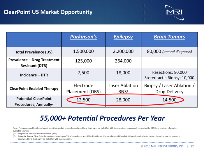 Growing the ClearPoint Footprint Installed Base of 39 sites in the US June, 2015 © 2015 MRI INTERVENTIONS, INC. | 21 |