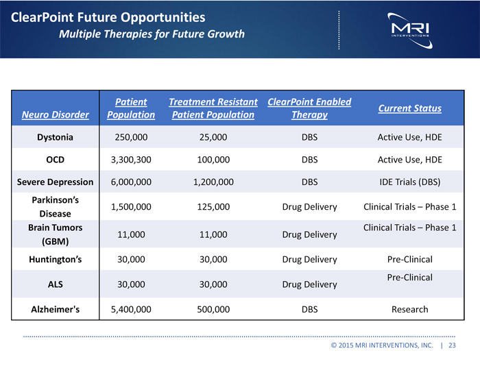 ClearPoint US Market Opportunity Parkinson's Epilepsy Brain Tumors Total Prevalence (US) 1,500,000 2,200,000 80,000 (annual diagnosis) Prevalence - Drug Treatment 125,000 264,000 Resistant (DTR) Incidence - DTR 7,500 18,000 Resections: 80,000 Stereotactic Biopsy: 10,000 Electrode Laser Ablation Biopsy / Laser Ablation / ClearPoint Enabled Therapy Placement (DBS) RNS1 Drug Delivery Potential ClearPoint 12,500 28,000 14,500 Procedures, Annually2 55,000+ Potential Procedures Per Year Note: Prevalence and Incidence based on either market research conducted by a third party on behalf of MRI Interventions or research conducted by MRI Interventions of publicly available sources. (1) Responsive neurostimulation device (RNS) (2) Potential Annual ClearPoint Procedures based upon 5% of prevalence and 85% of incidence; Potential Annual ClearPoint Procedures for brain tumors based on market research conducted by a third party on behalf of MRI Interventions. © 2015 MRI INTERVENTIONS, INC. | 22 |