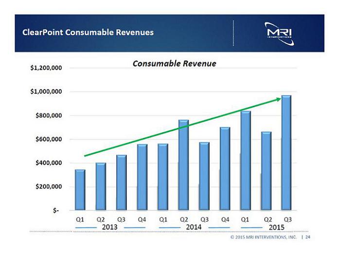 ClearPoint Consumable Revenues Consumables $1,200,000 $1,000,000 $800,000 $600,000 $400,000 $200,000 $- Q1 Q2 Q3 Q4 Q1 Q2 Q3 Q4 Q1 Q2 2013 2014 2015 © 2015 MRI INTERVENTIONS, INC. | 24 |