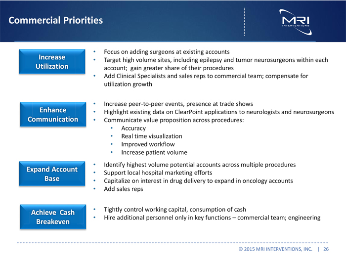 Commercial Priorities o Focus on adding surgeons at existing accounts Inc Increase o Target high volume sites, including epilepsy and tumor neurosurgeons within each Utilization n account; gain greater share of their procedures o Add Clinical Specialists and sales reps to commercial team; compensate for utilization growth o Increase peer-to-peer events, presence at trade shows Enhance o Highlight existing data on ClearPoint applications to neurologists and neurosurgeons Communication o Communicate value proposition across procedures: o Accuracy o Real time visualization o Improved workflow o Increase patient volume o Identify highest volume potential accounts across multiple procedures Expand Account o Support local hospital marketing efforts Base o Capitalize on interest in drug delivery to expand in oncology accounts o Add sales reps o Tightly control working capital, consumption of cash Achieve Cash o Hire additional personnel only in key functions - commercial team; engineering Breakeven © 2015 MRI INTERVENTIONS, INC. | 26 |