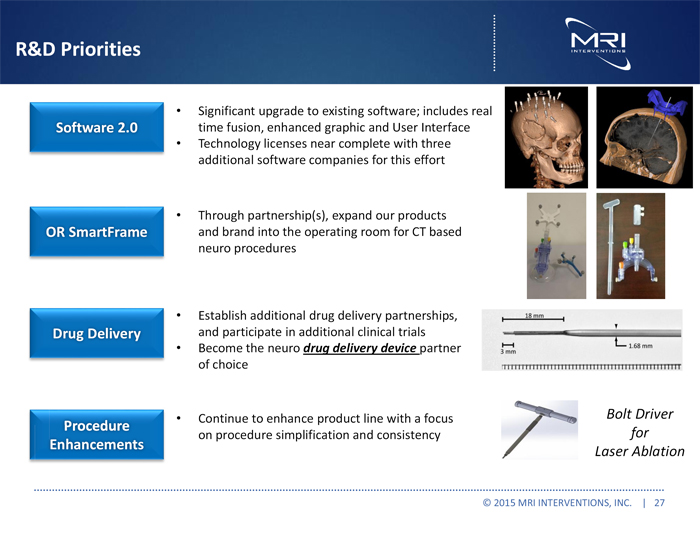 R&D Priorities o Significant upgrade to existing software; includes real Software 2.0 time fusion, enhanced graphic and User Interface o Technology licenses near complete with three additional software companies for this effort o Through partnership(s), expand our products OR SmartFrame and brand into the operating room for CT based neuro procedures o Establish additional drug delivery partnerships, Drug Delivery and participate in additional clinical trials o Become the neuro drug delivery device partner of choice o Continue to enhance product line with a focus Bolt Driver Procedure on procedure simplification and consistency for Enhancements Laser Ablation © 2015 MRI INTERVENTIONS, INC. | 27 |