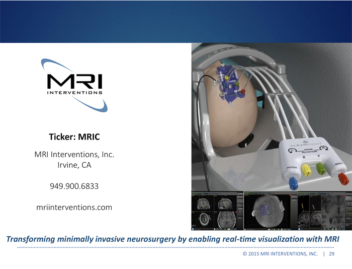 Ticker: MRIC MRI Interventions, Inc. Irvine, CA 949.900.6833 mriinterventions.com Transforming minimally invasive neurosurgery by enabling real-time visualization with MRI © 2015 MRI INTERVENTIONS, INC. | 29 |