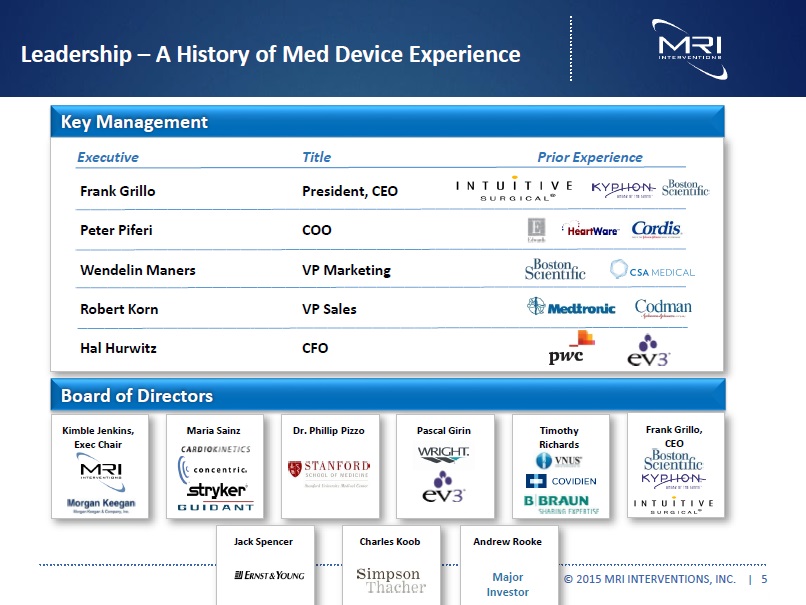 MRI Interventions: Real Time MRI Guided Surgery First-to-market technology platform enabling real-time MRI guided surgery; FDA-cleared, CE-marked and 40+ ClearPoint sites Focused commercialization of neuro platform underway, gaining traction; recent restructuring complete Attractive razor/razorblade business model with strong margins Compatible with all major MRI manufacturers; Interoperability w/ Medtronic, Monteris, neuro products Strong intellectual property portfolio Strong management team with extensive medical device commercialization experience: Intuitive, Medtronic, Kyphon, Boston Scientific, Edwards Lifescience, Cordis © 2015 MRI INTERVENTIONS, INC. | 4 |