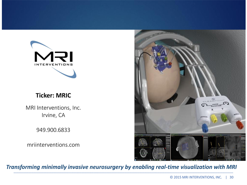 Ticker: MRIC MRI Interventions, Inc. Irvine, CA 949.900.6833 mriinterventions.com Transforming minimally invasive neurosurgery by enabling real-time visualization with MRI © 2015 MRI INTERVENTIONS, INC. | 30 |