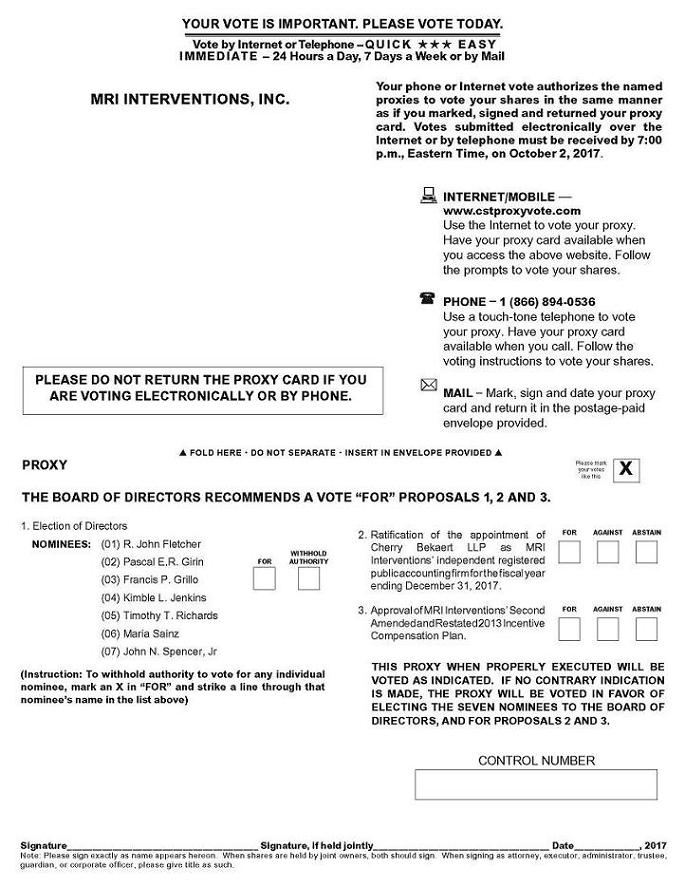 With this letter, we have enclosed a copy of our Annual Report on Form 10-K for the year ended December 31, 2016, Notice of Annual Meeting of Stockholders, Proxy Statement and Proxy Card. These materials provide further information about our Annual Meeting. If you would like another copy of our Annual Report, please send your request to MRI Interventions, Inc., Attn: Corporate Secretary, 5 Musick, Irvine, California 92618, and one will be mailed to you. It is also available on the Internet at www.cstproxy.com/mriinterventions/2017.