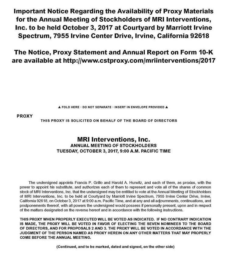 With this letter, we have enclosed a copy of our Annual Report on Form 10-K for the year ended December 31, 2016, Notice of Annual Meeting of Stockholders, Proxy Statement and Proxy Card. These materials provide further information about our Annual Meeting. If you would like another copy of our Annual Report, please send your request to MRI Interventions, Inc., Attn: Corporate Secretary, 5 Musick, Irvine, California 92618, and one will be mailed to you. It is also available on the Internet at www.cstproxy.com/mriinterventions/2017.