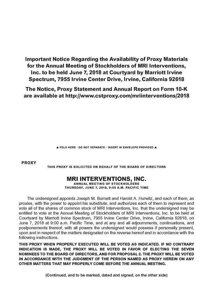 With this letter, we have enclosed a copy of our Annual Report on Form 10-K for the year ended December 31, 2017, Notice of Annual Meeting of Stockholders, Proxy Statement and Proxy Card. These materials provide further information about our Annual Meeting. If you would like another copy of our Annual Report, please send your request to MRI Interventions, Inc., Attn: Corporate Secretary, 5 Musick, Irvine, California 92618, and one will be mailed to you. It is also available on the Internet at www.cstproxy.com/mriinterventions/2018.