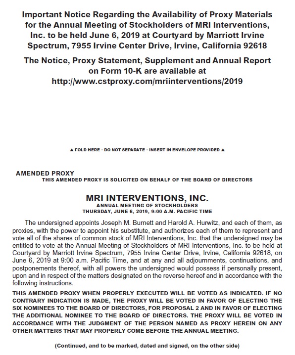 This Supplement, the Proxy Statement, the amended proxy card and our 2018 Annual Report on Form 10-K are available on the internet at www.cstproxy.com/mriinterventions/2019. In addition, a copy of the 2018 Annual Report on Form 10-K will be provided without charge upon the written request of any stockholder to MRI Interventions, Inc., Attn: Corporate Secretary, 5 Musick, Irvine, California 92618, and may be found on the Company’s website at www.mriinterventions.com.